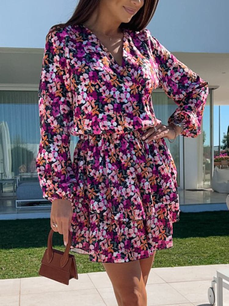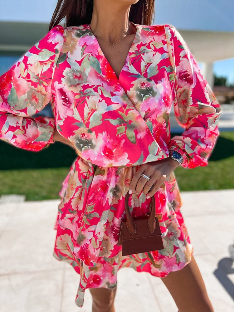New Elegant V-Neck Design Lace-Up Ruffles Mini Dress