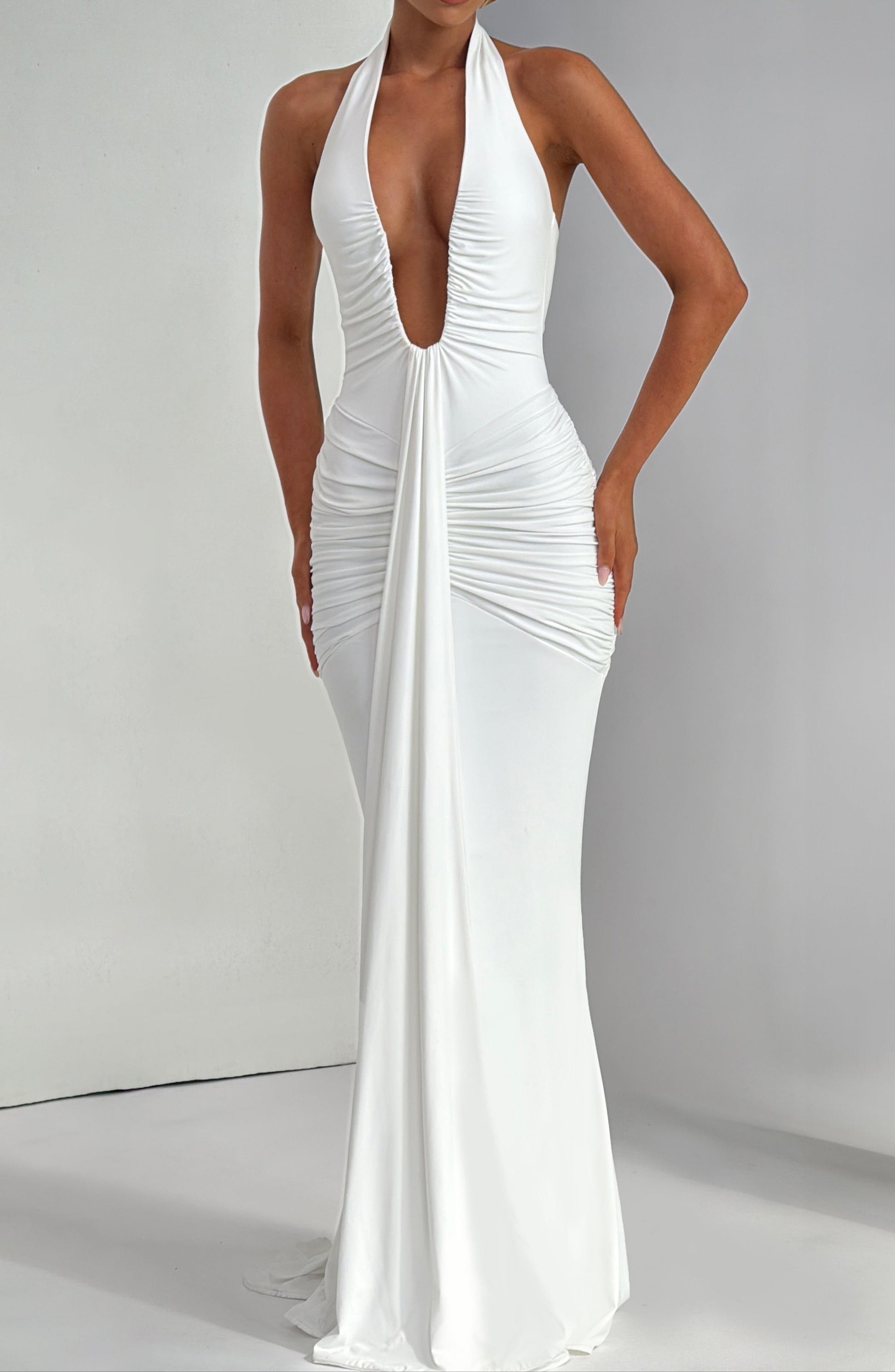 Embrace effortless glamour with this stunning white maxi dress. designed to exude sophistication and timeless elegance. Crafted from luxurious slinky jersey. this dress drapes beautifully for a figure-flattering silhouette that moves with grace.