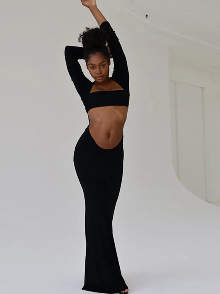 Autumn Solid Color Hollow Out Elegant Midnight Night Hot Midi Dresses