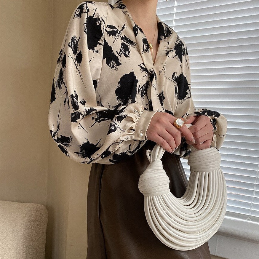 Bianca Black Floral Print Blouse - 3 Colors. Beautiful elegant brush stroke floral prints midweight satin blouse. Collarless V-neck with neatly gathered panel front is so lovely.