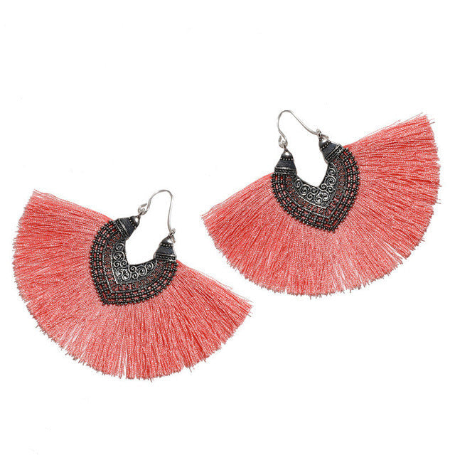 Big Fan Tassel Statement Earrings - 14 Colors. Bohemian Hoop earring with colorful tribal style fan tassels. 14 gorgeous colors.