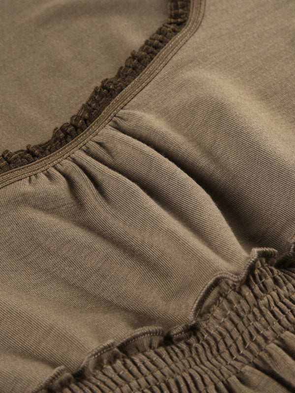 Brown Vintage Square Collar Stitching Long Sleeve Tee