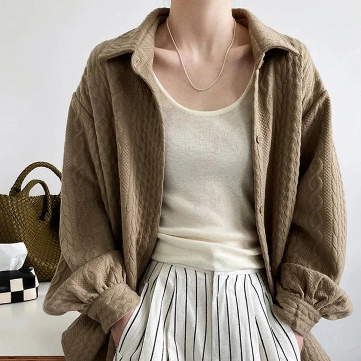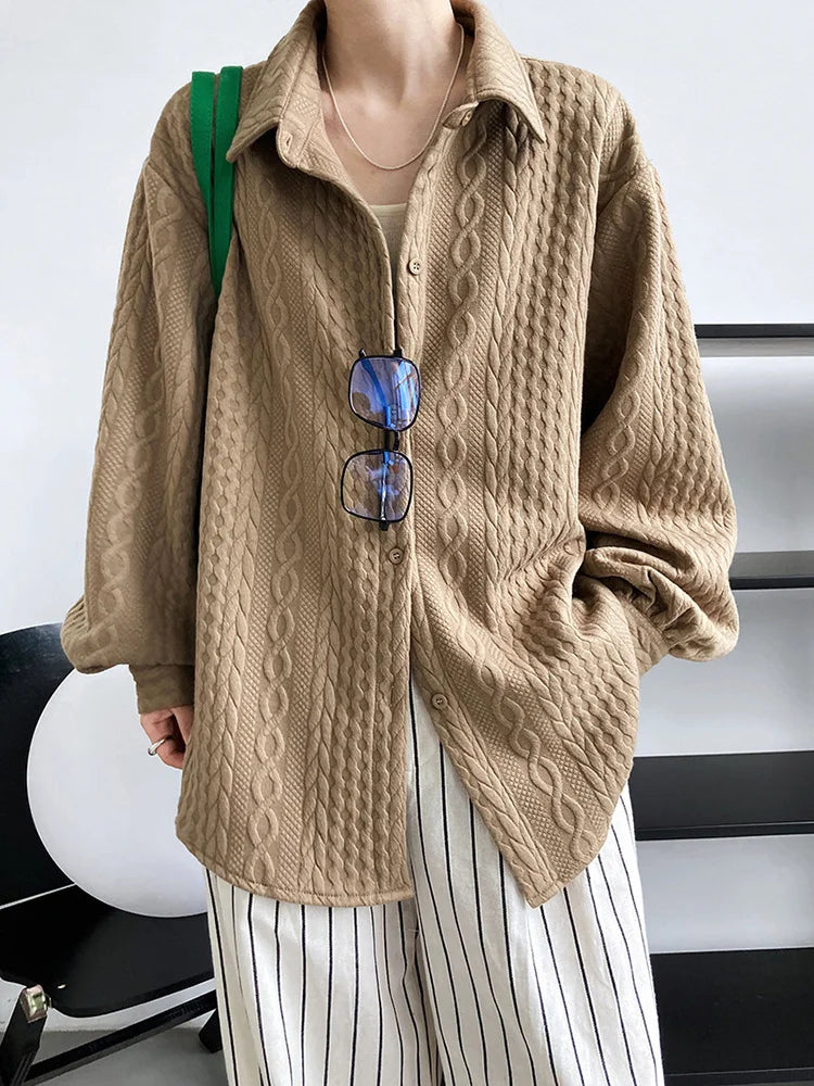Get cozy in style with our Cable Knit Textured Cotton Shirt Blouse. This unique top features a midweight cable knit texture. shirt front and slight balloon sleeve of blouse. adding depth and dimension to any outfit. Sometimes. all the good things could happen all at the same time!