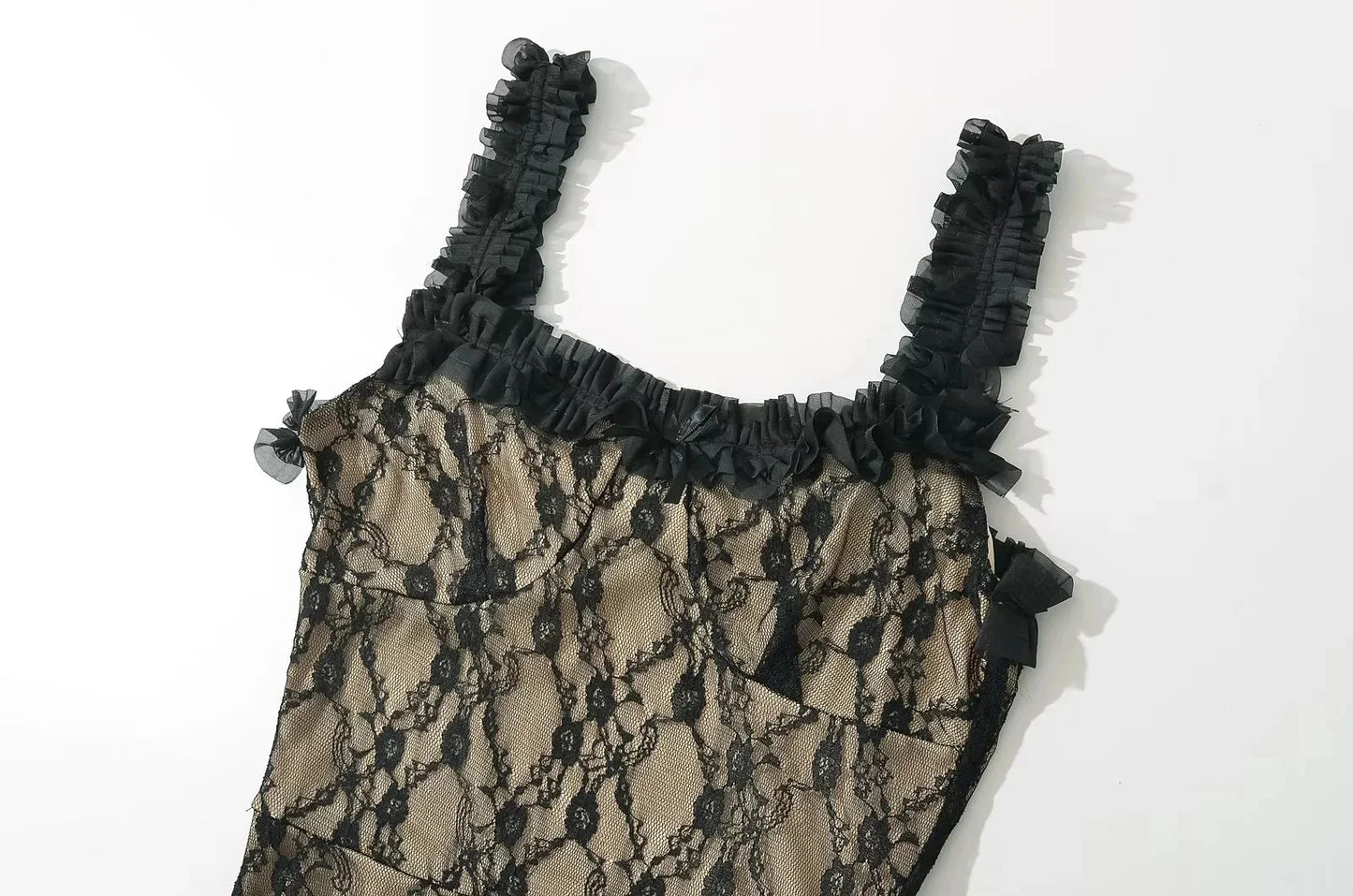 Mingle and dazzle in the Clydie Lace Mesh Bodycon Midi Dress. This stunning dress features delicate lace and mesh with feminine frill trims details. creating a flattering bodycon silhouette. with Perfect for any occasion. this dress will make sure you stand out in style. Get ready to turn heads and feel confident!