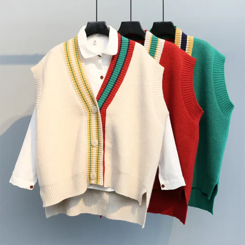 Stay comfortable and stylish in this cool Color Contrast Stripe Trim Knit Vest! This vest features soft knit fabric and a sleek stripe trim design. perfect for adding effortless style to any casual look. Oversized and layering style. One Size.