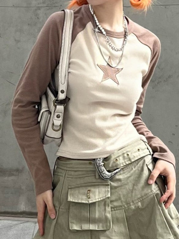 Contrast Color Y2K Raglan Sleeve Star Patch Knit Crop Top