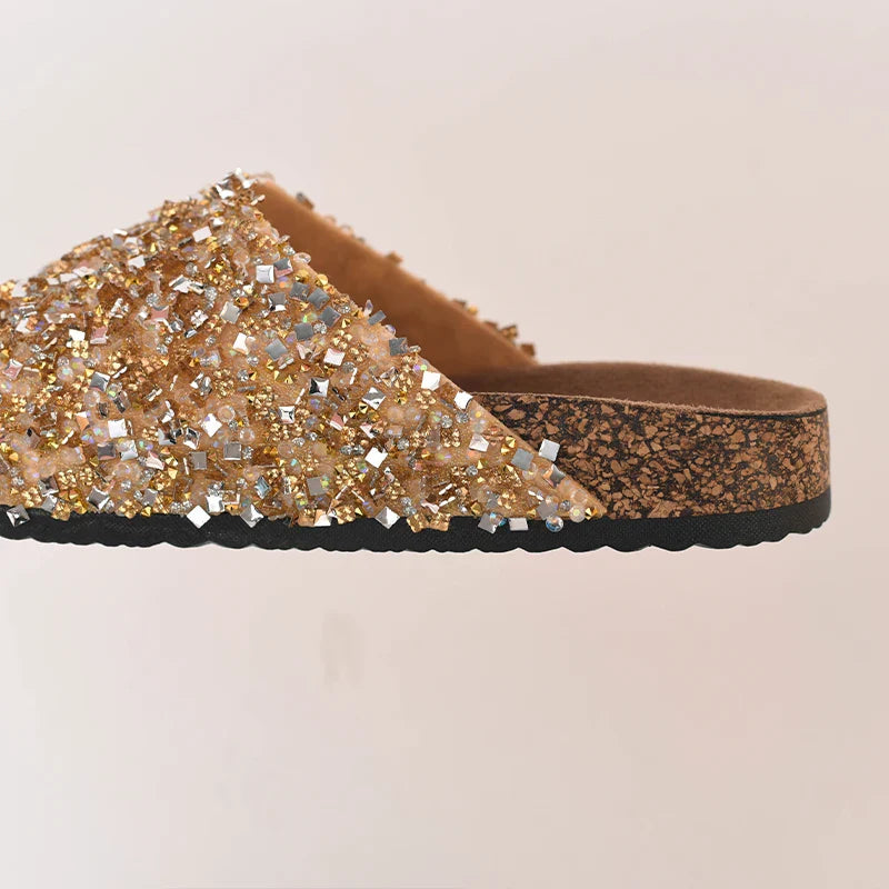 Get ready to shine with the Corey Gold Sequin Cork Slipper! These slip-ons feature a dazzling gold sequin design and a comfortable cork sole. Perfect for adding a touch of glamour to any outfit. Slip into style with the Corey Gold Sequin Cork Slipper. (No slippin'. just sequins!)