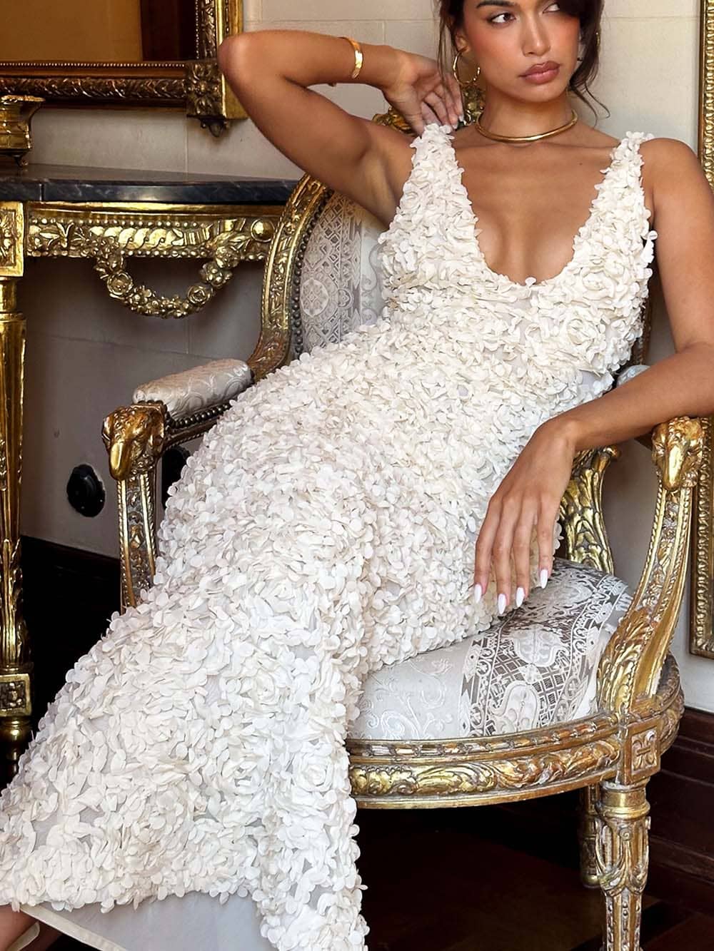 CREME PLUNGE FLORAL APPLIQUÉ MAXI DRESS