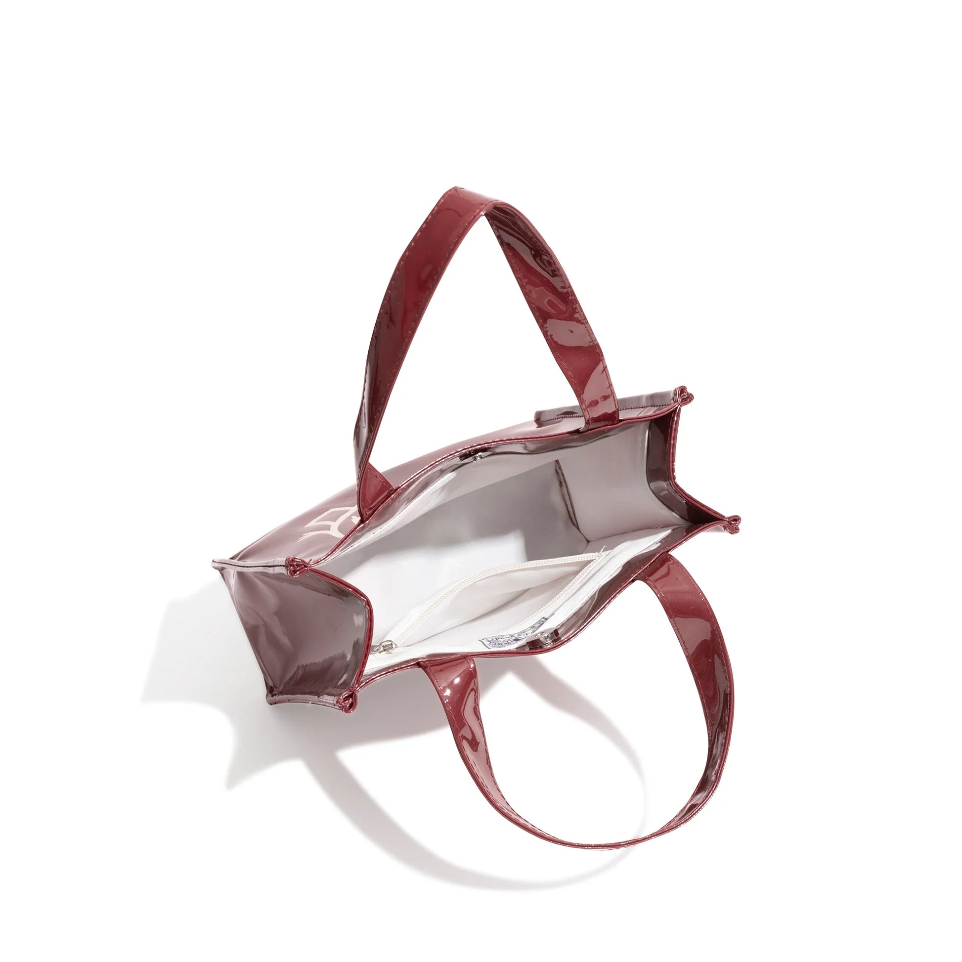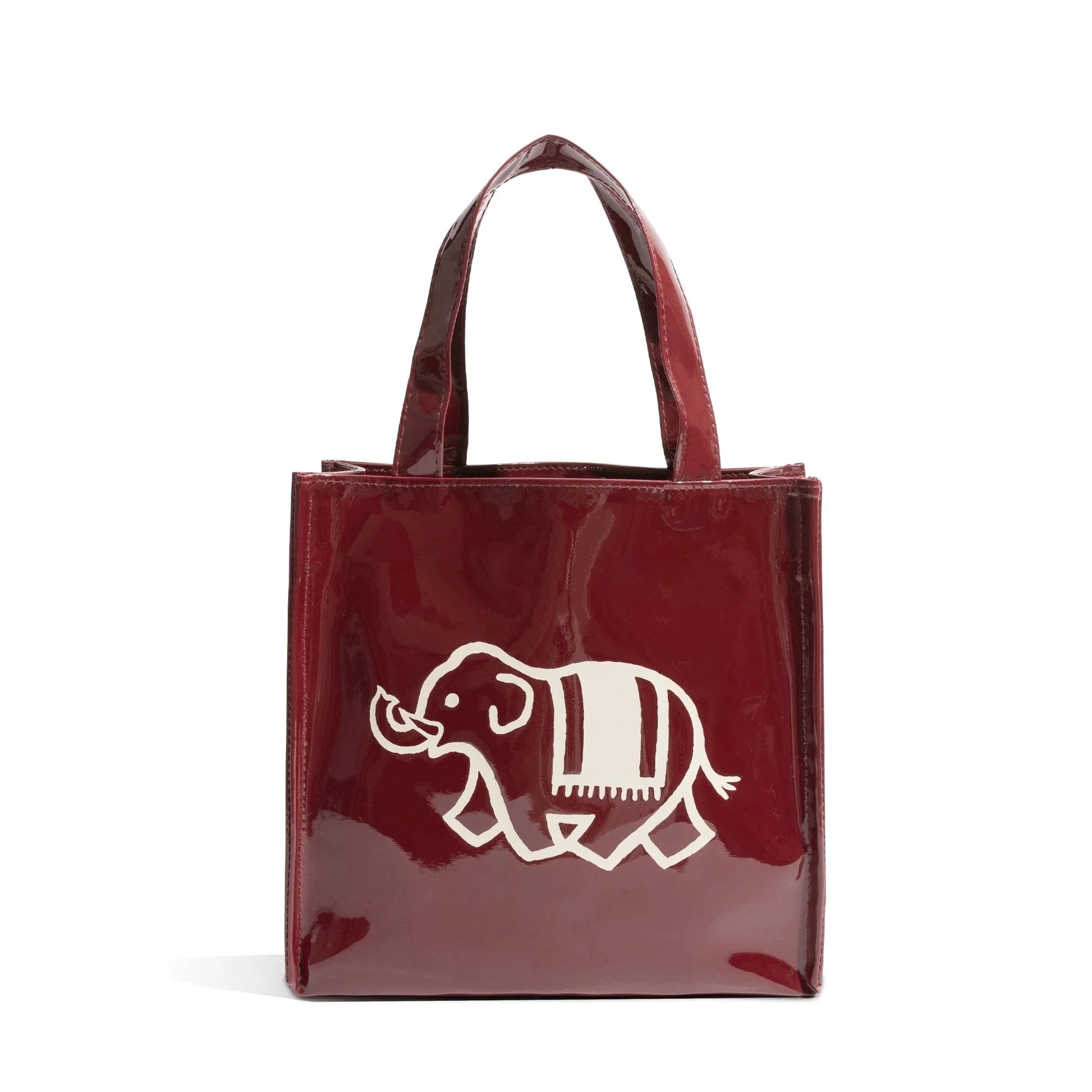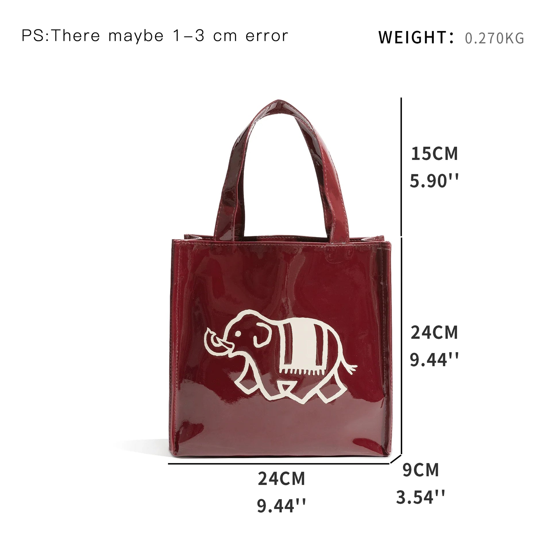 This adorably compact tote is perfect for carrying your essentials while showing off some personality. The glossy finish is sure to catch eyes. while the cute elephant print adds a playful touch. Don't let its small size fool you. this tote packs a punch of quirkiness.