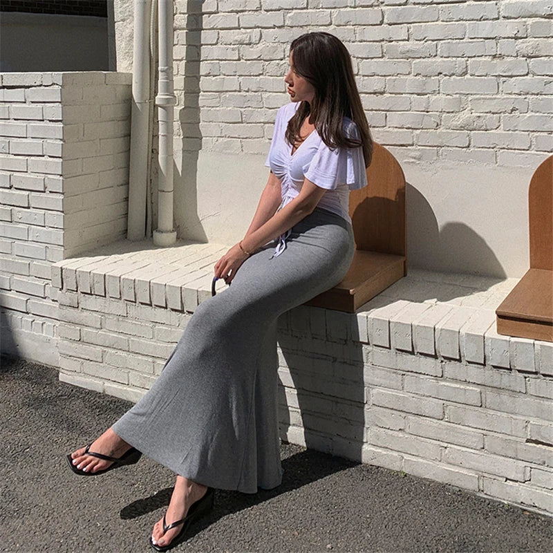 Drawstring Orange Vintage High Waist Maxi Tight Elegant Skirt