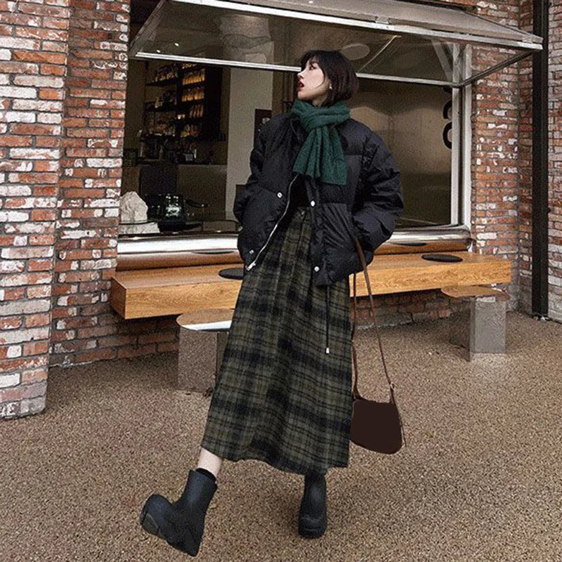 Vintage Woolen Plaid High Waist A-Line Midi Skirt