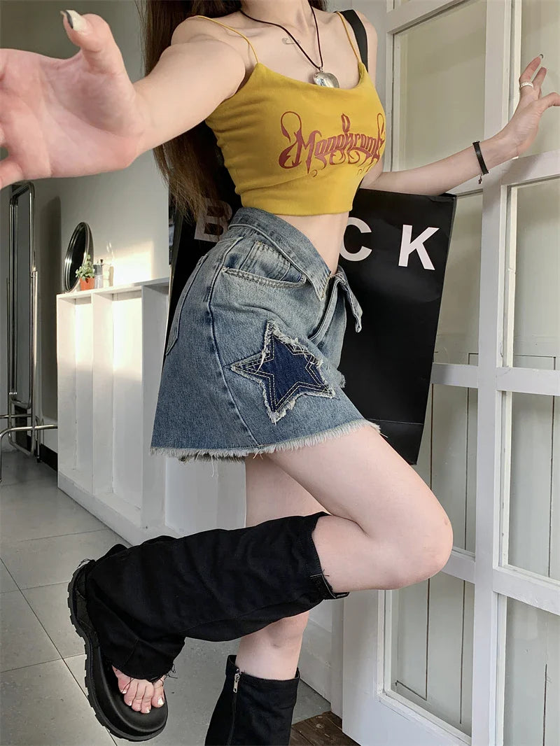 Y2k Star Patch Raw Hem Cuffs A-line Short Skirt