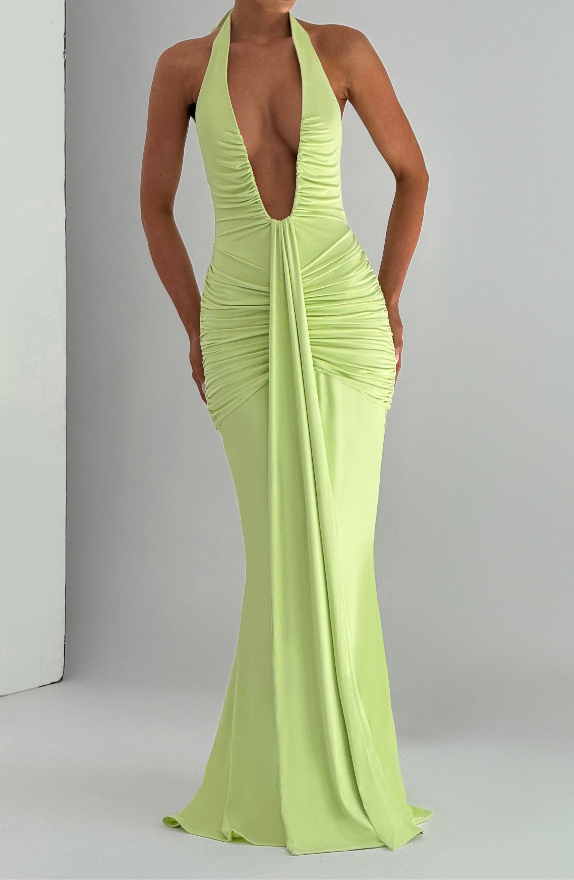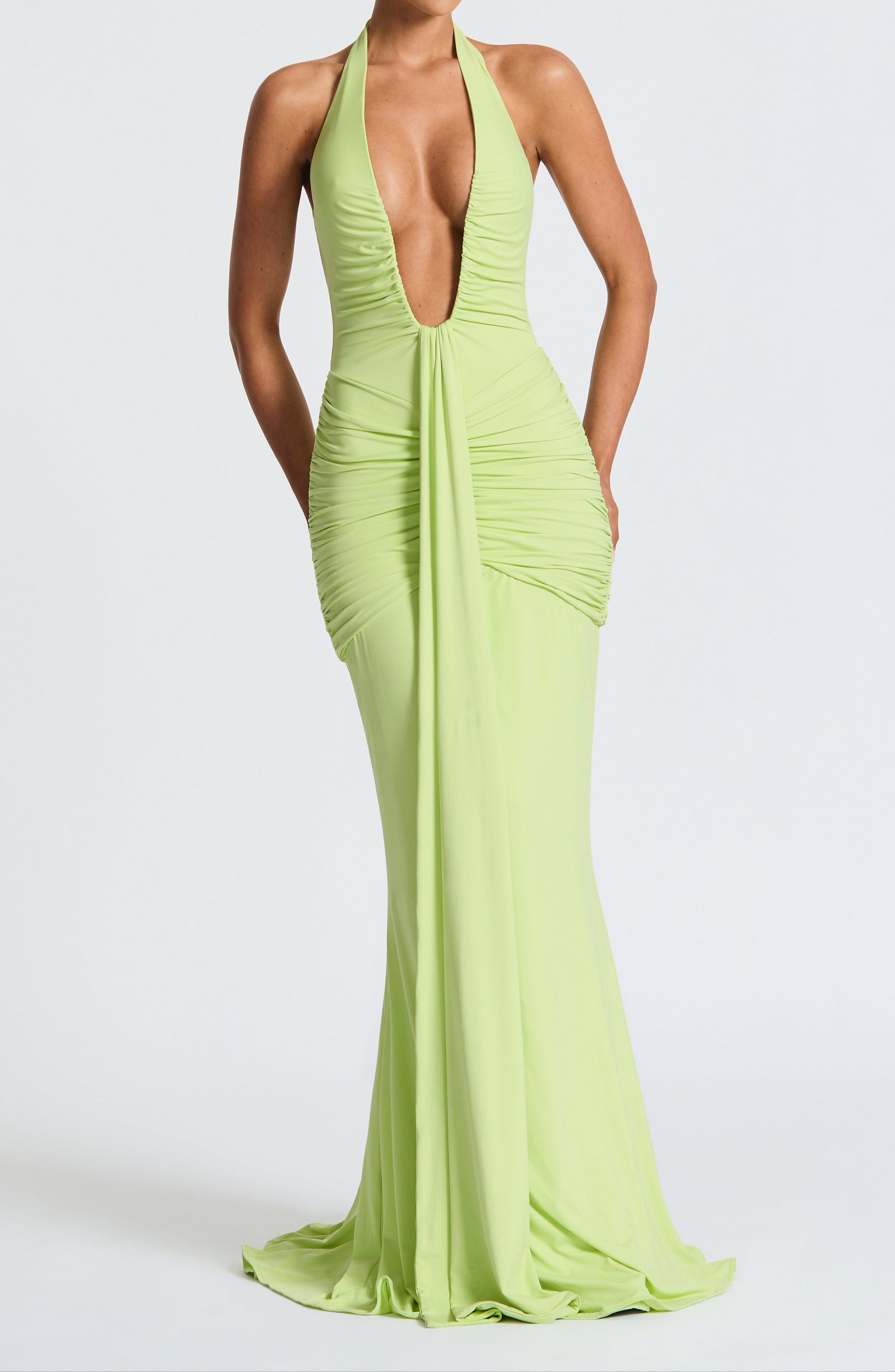 Make a statement with this stunning maxi dress. designed to blend luxury with effortless elegance. The vibrant lime hue and slinky jersey fabric create a eye-catching look. while thoughtful details like the plunge neckline and draped panel add a touch of sophistication.
