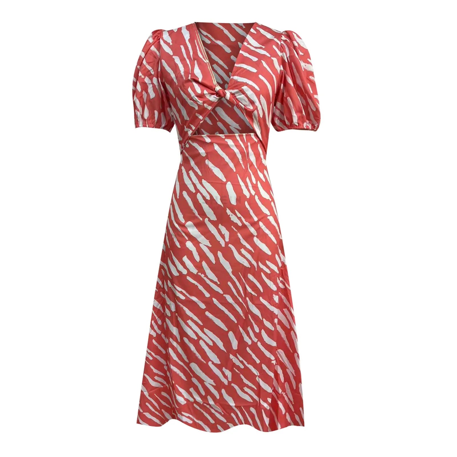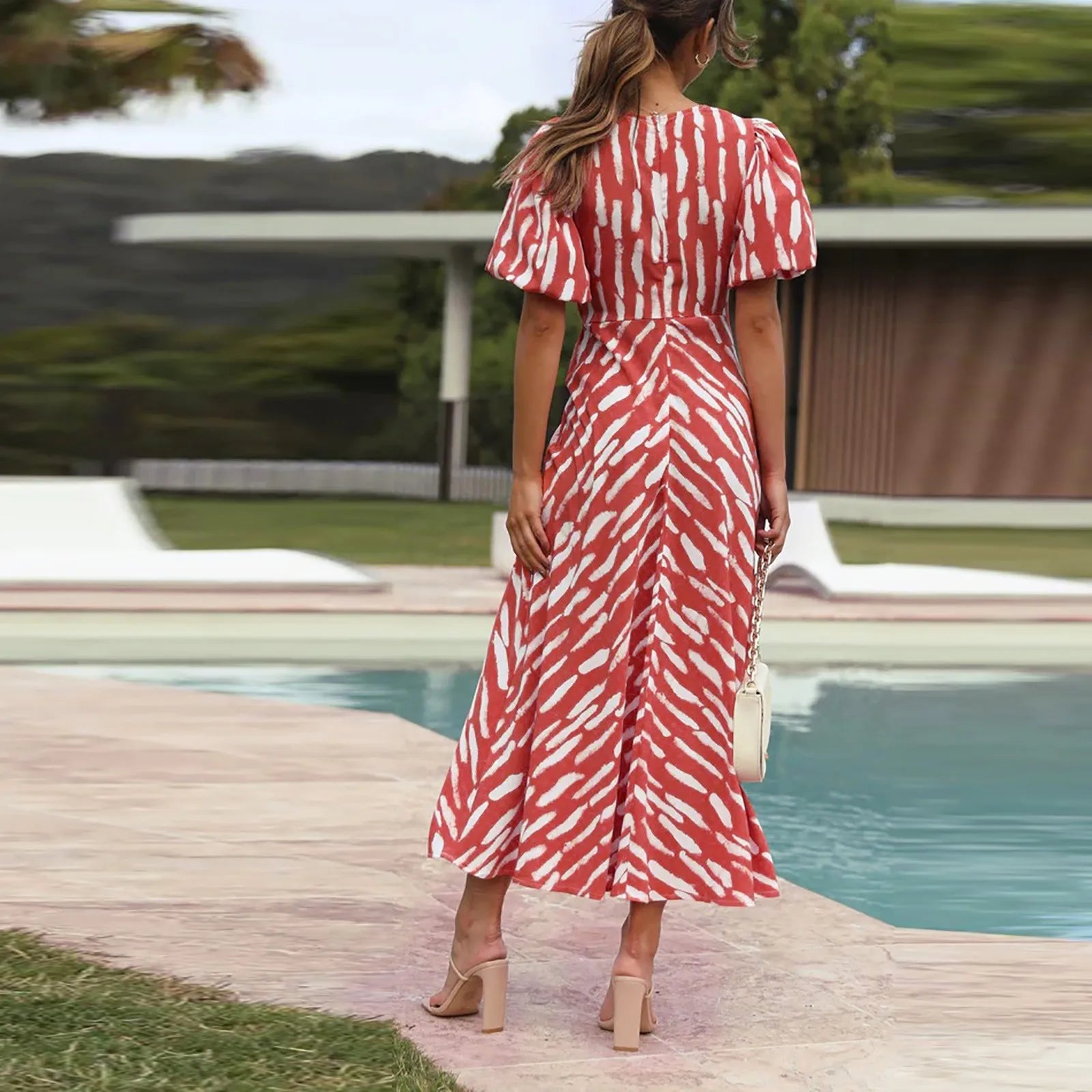 Elegant Boho Stripe Print V-Neck Puff Sleeve Midi Dress