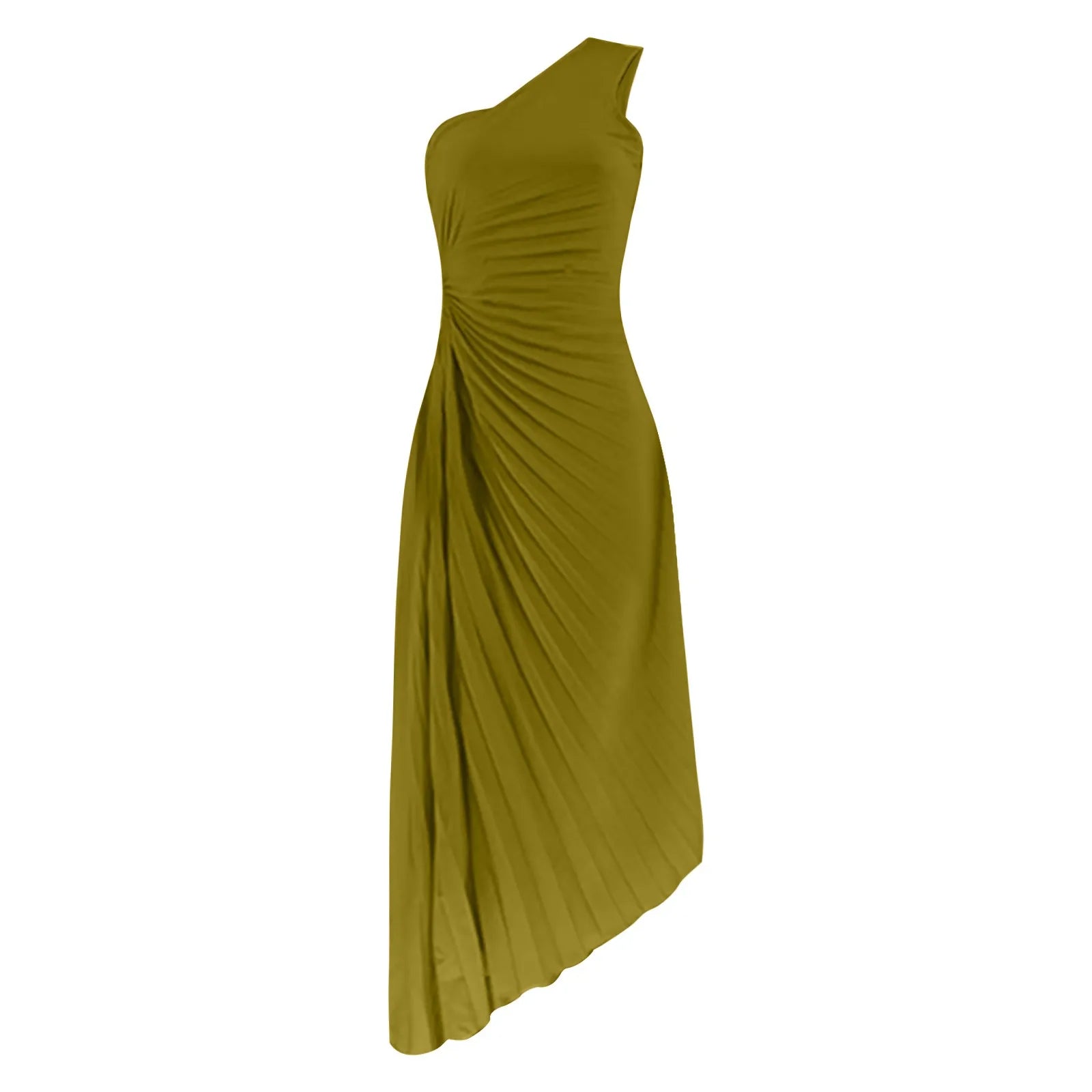 Elegant One Shoulder Pleated Simple Sleeveless High Waist Long Formal Party Summer Casual Dress