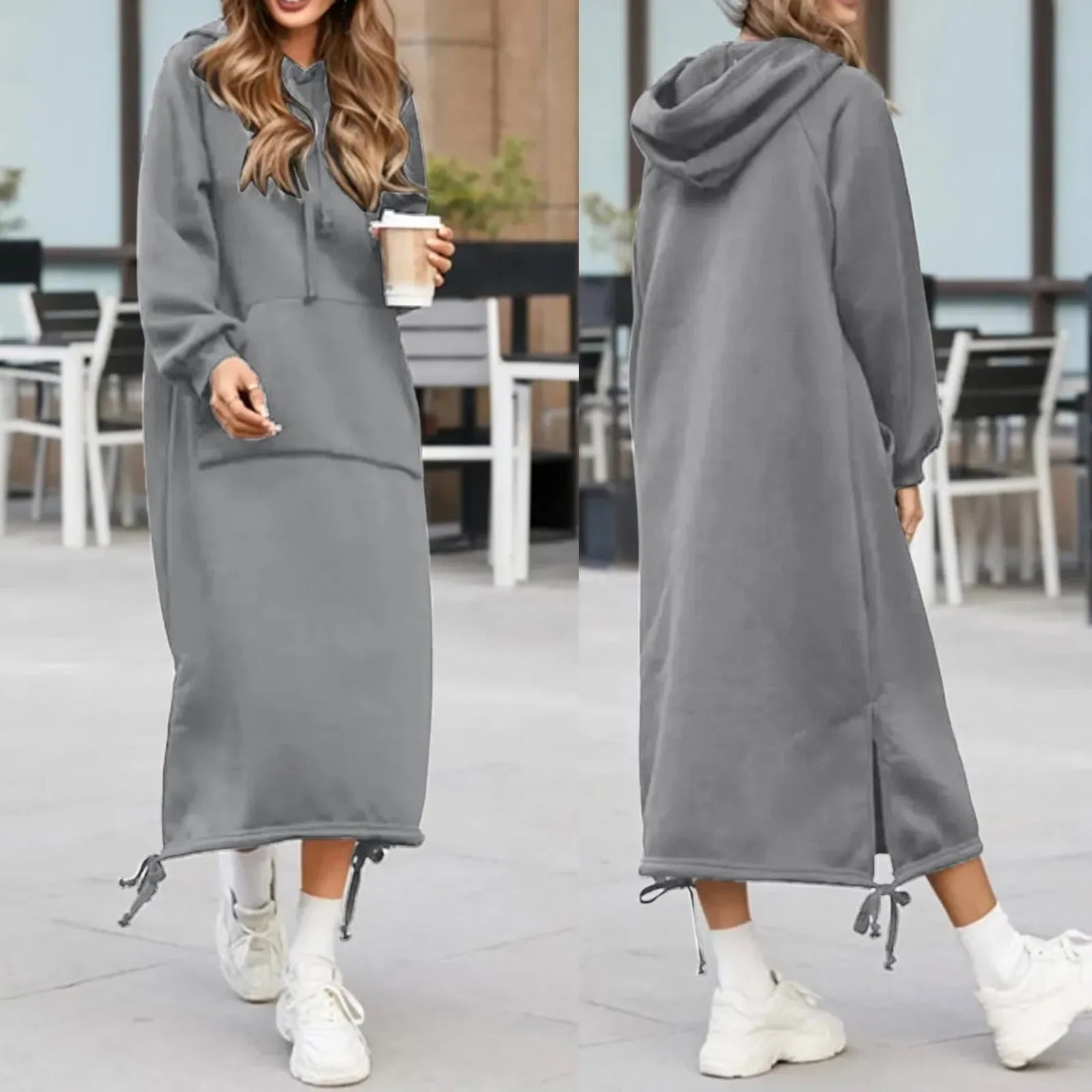 Elegant Split Hooded Large Pullover Casual Autumn Pocket Warm Sweatshirt Fashion Hoodie Dress