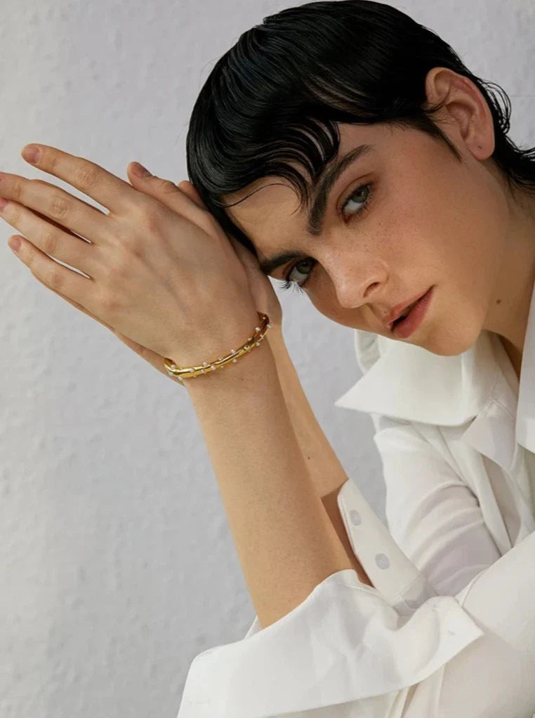 Introducing our Elegant Sprinkled Pearls Cuff Bracelet. perfect for adding a touch of sophistication to any outfit. Featuring delicate pearls sprinkled throughout the elegant cuff design. this bracelet exudes luxury and exclusivity. Elevate your style with this exquisite piece of jewelry.