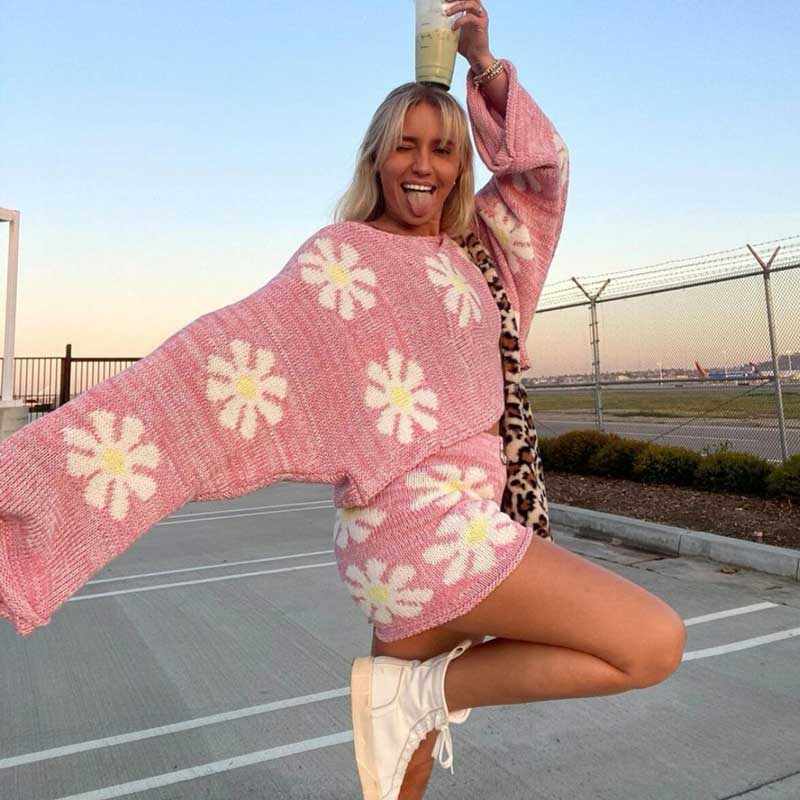 Eliza Daisy Prints 2-Piece Knit Set - 2 Colors. Cute oversized knit top with matching short. Relaxed California style knit set with bohemian flower prints and ring zipper head.