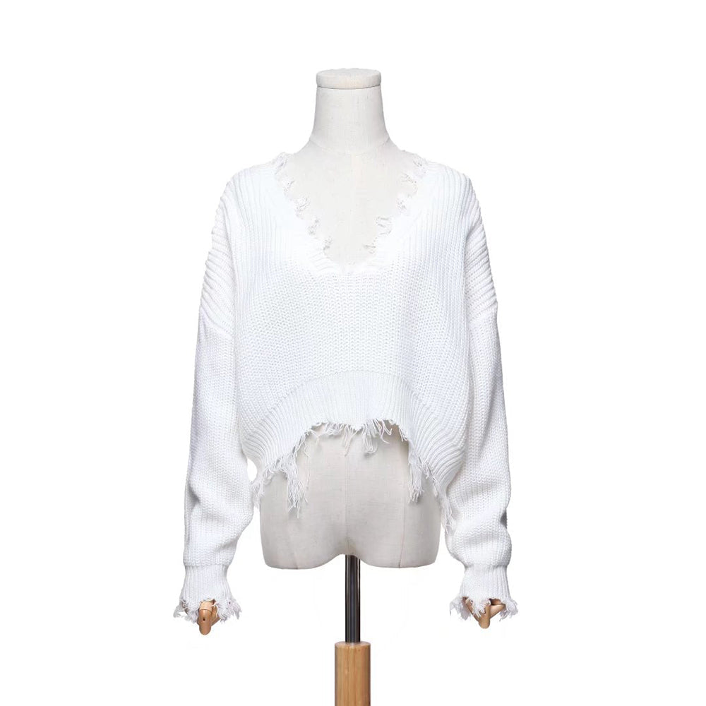 Destroyed and distressed sweaters never look this cool. Fringed edges and cropped with deep v-neck goes off the shoulder and great for layover tank tops and more. And you can totally wear it front/back reversed. too! Emily is back to rock the streets!