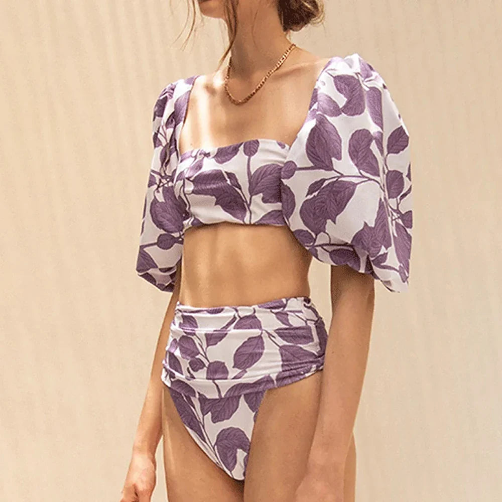 Get ready to make a splash with the Esa Purple Floral Two Piece Retro Swimsuit! This trendy and playful two piece ensemble showcases a lovely purple floral pattern - bandeau and puff sleeve fusion with a back bow tie sure to catch some eyes. With its retro cut and comfortable fit. you'll feel confident and playful at the beach or pool. You can also totally wear the top out of pool side to the street!