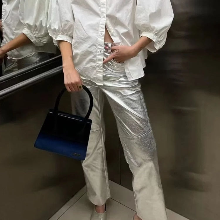Farah Silver Metallic Bootcut Jeans. Simple and super stylish silver metallic jeans. Mid rise. semi matte. Great for casual or biker styles.