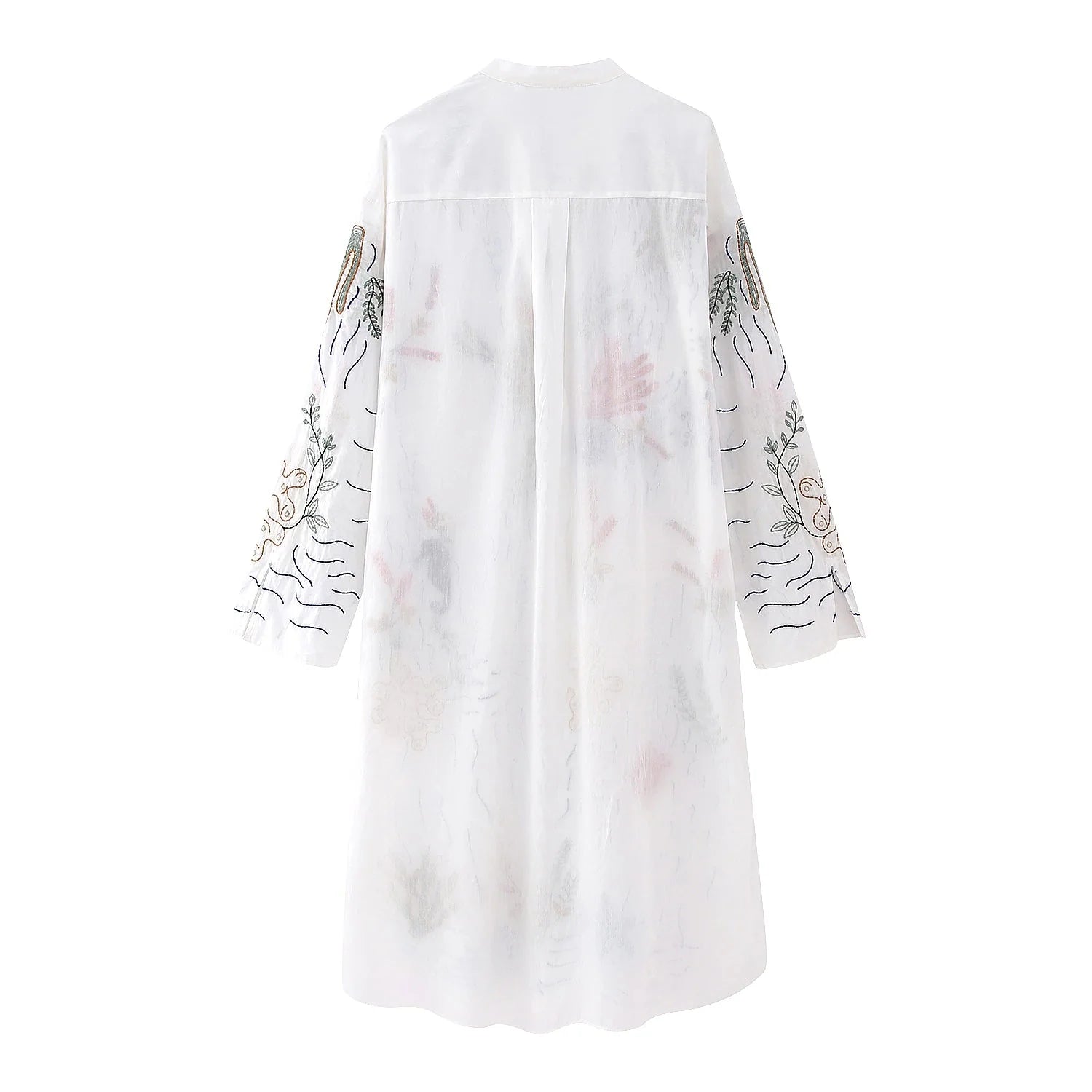 Look absolutely ravishing in the Freyja Bohemian Embroidery Shirt Dress! This whimsical. boho-style dress features intricate marine life embroidery details with tunic style cuts at the cuffs and side hems that'll have you ready for the beach or lounging in style at no time. Look and feel your best in this piece that'll have you looking like a true queen—ooh la la! Semi-sheer.