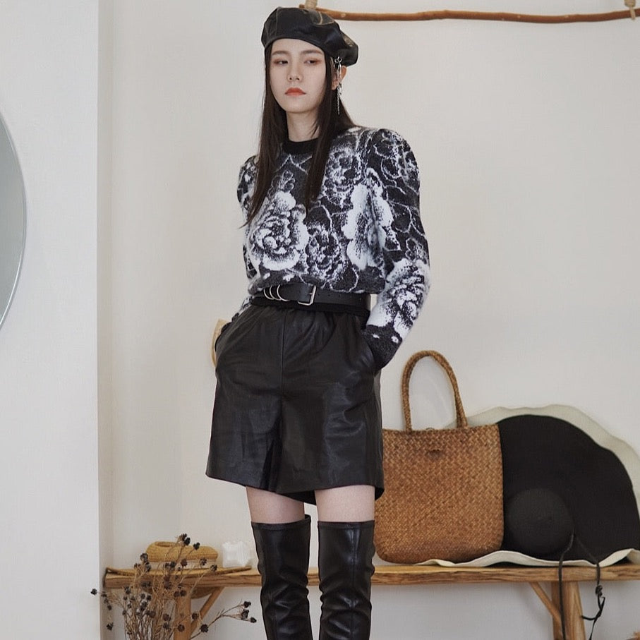 Giola Black and White Flower Sweater. Lovely intarsia mohair sweater with all over black and white dark floral flowers. Puff sleeves. Fuzzy soft texture to love. Great for gothic romance. harajuku or that flower power look.