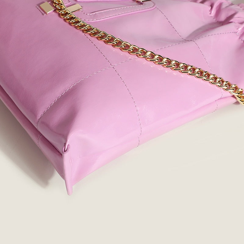 Go ahead. get a little carried away! Our Ires Faux Patent Leather Pouch Shopper Tote Bags are the perfect way to cruise around town in style - with luxe gold chains. trendy ruched details and two shining chic colors to choose from. it's like you've got twice the looks! Sleek. roomy and oh-so chic. Wowza!