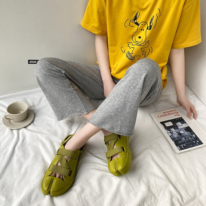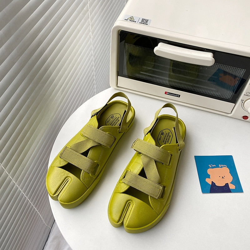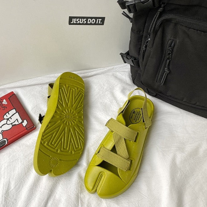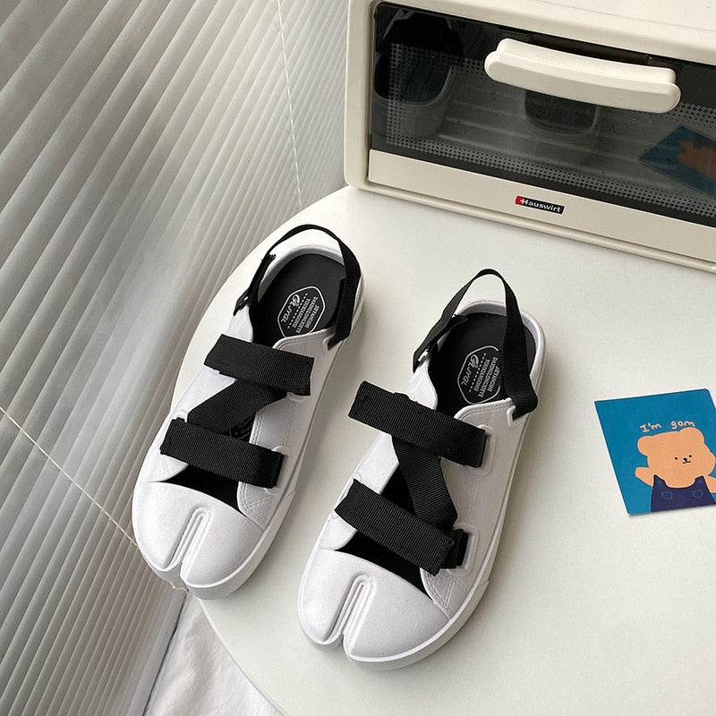Kanna Split Toe Minimalist Sling Back Sandals - 3 Colors. You could call this minimalist or utilitatian. Popular split toe look with elastic lace-up top and sling back closure. Great item for sporty chic or comfort chic.