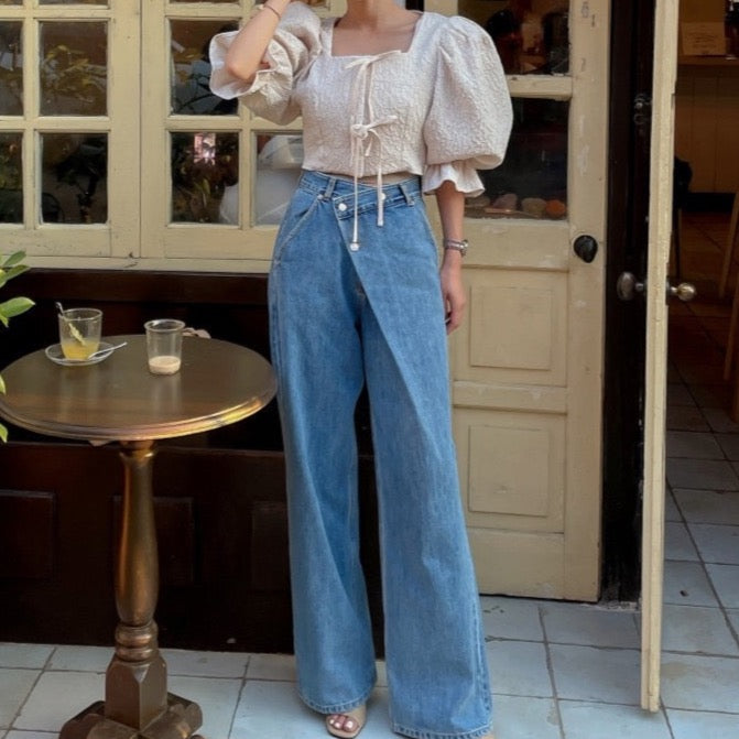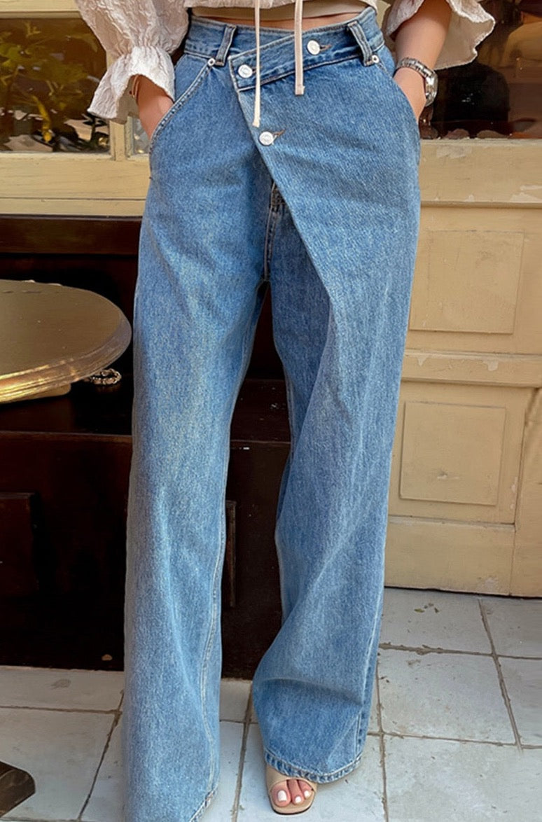 Kay Wrapped Button Fly Loose Jeans. What more to say. these jeans are trending and cool. Side wrapped like stealing from your boy's jeans and pinned up. yet the results are fashionable. Join the look.
