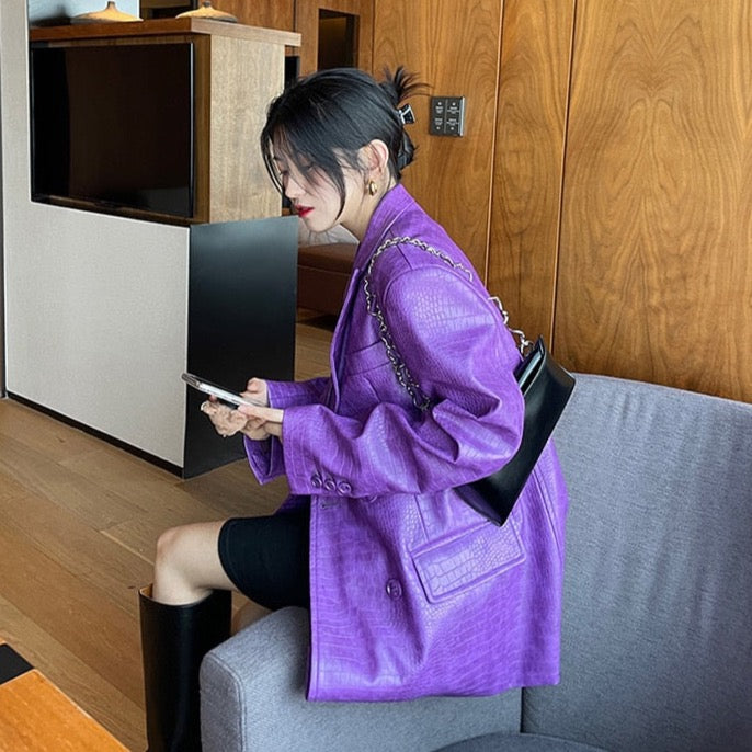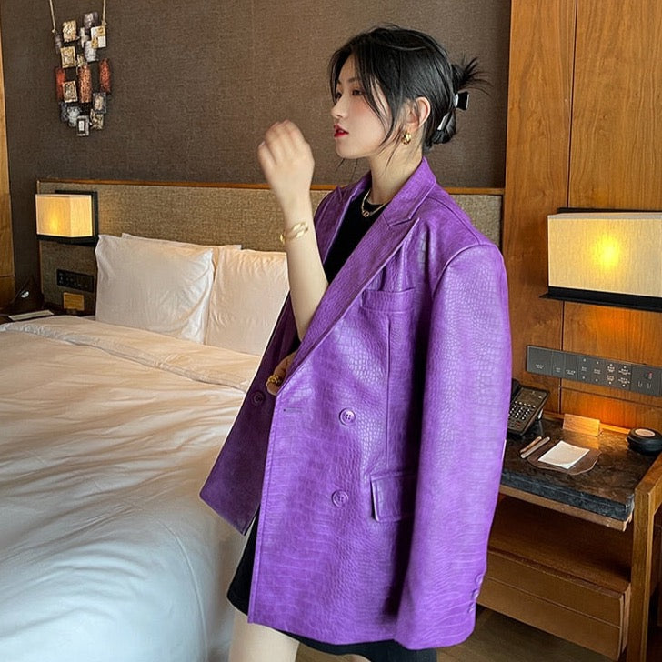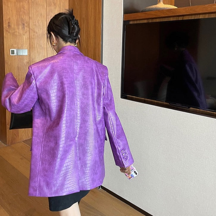 Laura Crocodile Pattern Faux Leather Blazer - 5 Colors. Simple blazer with color and crocodile pattern for a luxe upgrade. Add instant hip factor to your style with these blazers. Matching buttons. 5 Colors to choose from: Classic or color pops. For oversized look. order size up.
