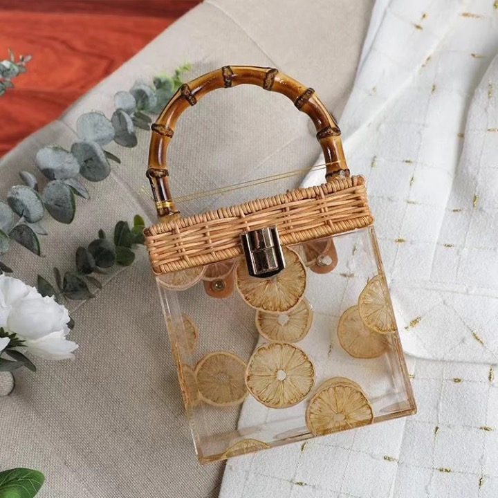 The Lexie Clear Acrylic Bamboo Handle Box Handbag offers a unique. playful twist to your everyday handbag. Made with durable and stylish clear acrylic with fun plants and fruits prints. this bag features a rattan box lid and bamboo handle design for a retro charm. Perfect for the stylish. fun-loving individual loves to show off and share what you have in your bag!