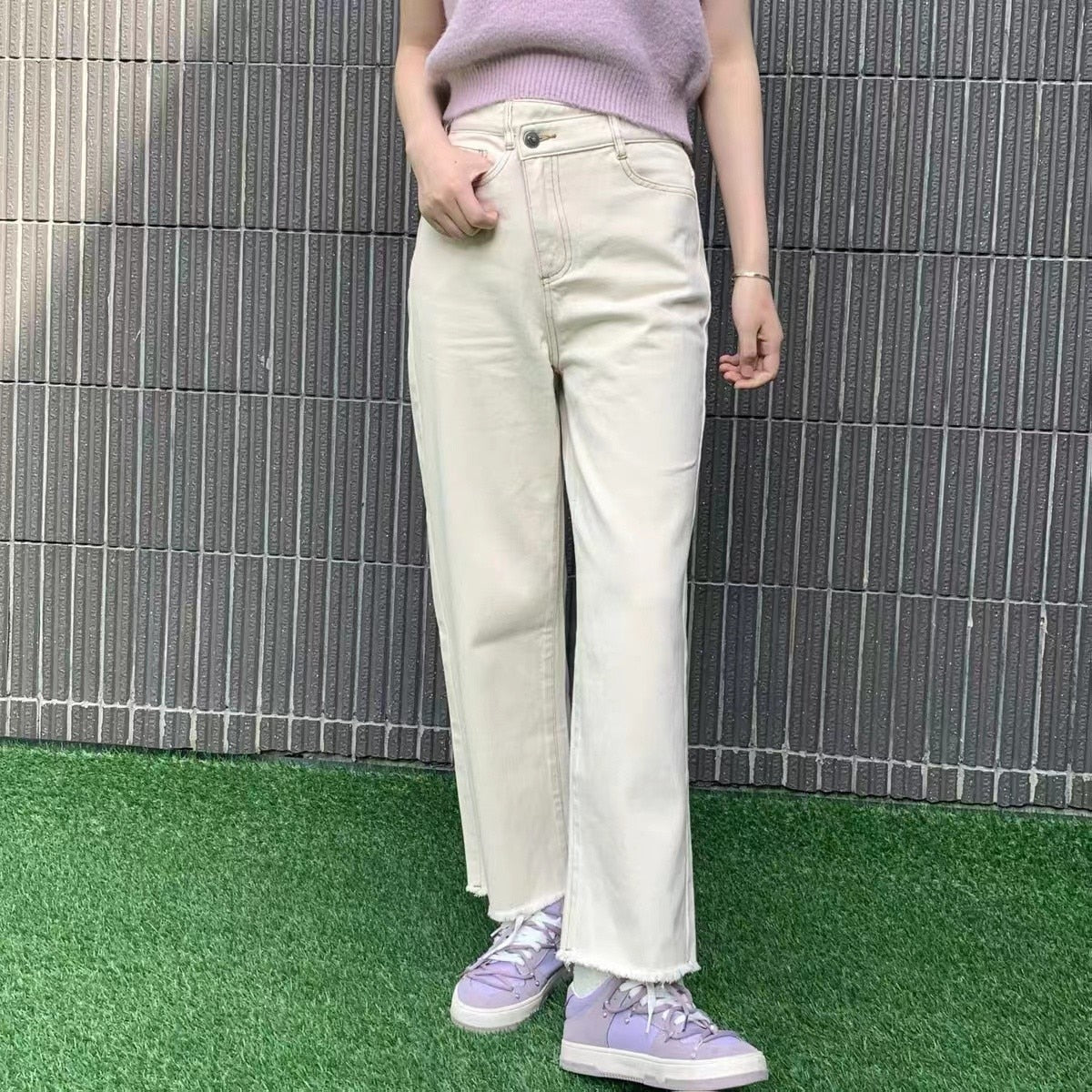 Lidia Flower Embroidery Off-White Jeans. High waisted off-white Jeans with adorable flower embroidery at the back pocket. Asymmetric front button fly and frayed hems. Unique design and instant bohemian and retro feel to love. Slight stretch. Length hit at ankle.