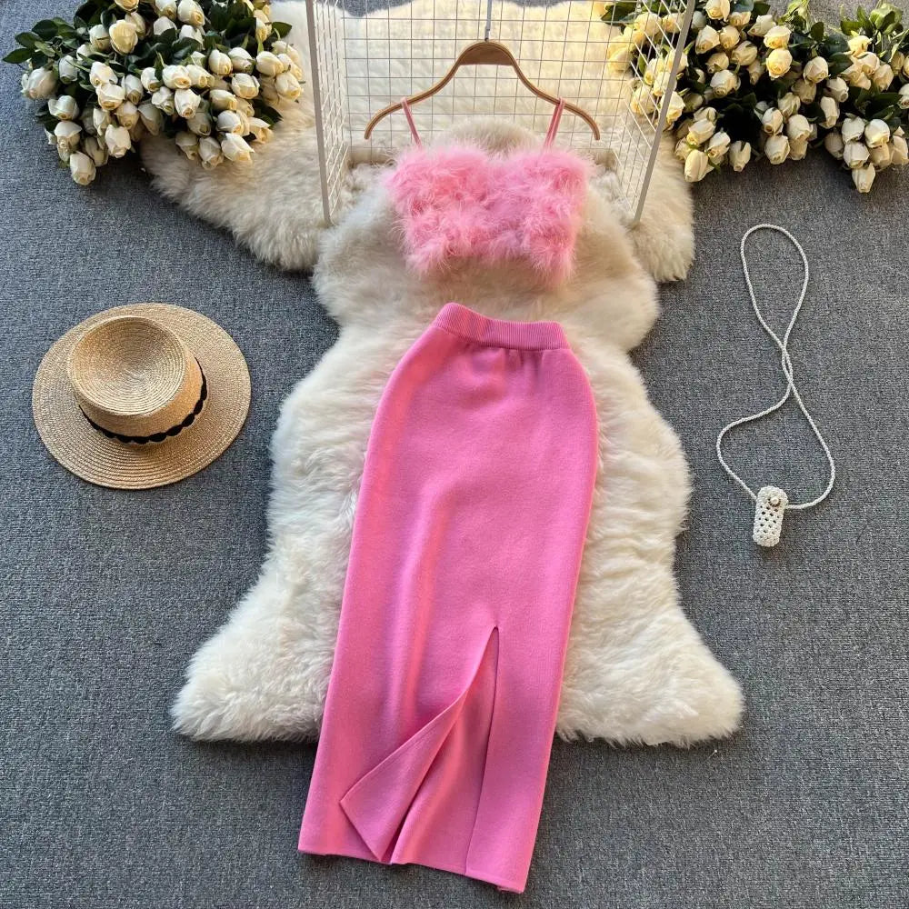 Be the epitome of chic with our Lina Two-Piece Faux Fur Bra Top and Knit Skirt Set. Combining a furry top. and a figure-flattering knit skirt. you'll be noted for your sartorial excellence any time you wear it. Gliding out for a day or evening?