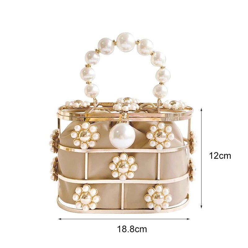 Hollow Pearl Flowers Metallic Wedding Clutch Purse Mini Bucket Handbag