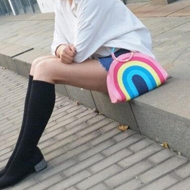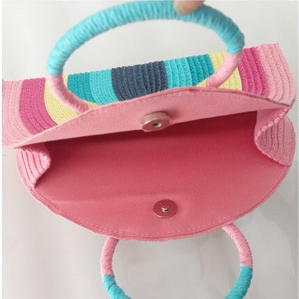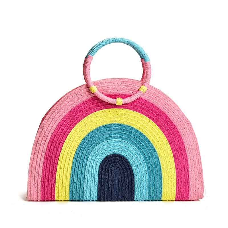 Malia Rainbow Stripe Woven Handbag. Beach day or not. these half moon shape rainbow woven bag with ring handle is just fun and adorable. Full of rainbow hope. this bag works in many styling ways like beach days. bohemian and street style or evern wedding. Style versatility is just limitless. Pair with solid flowy dress or casually with jeans and more!