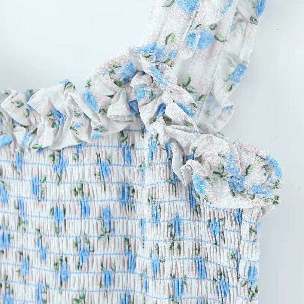 Margie Shirring Smocked Floral Dress - 2 Colors. Sweetest vintage style floral mini dress with shirring details and spaghetti straps. Shirring details with cute ruffling trims. this midi dress is beautifully feminine and romantic.