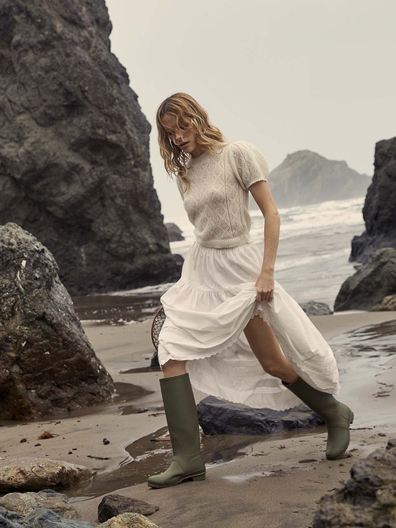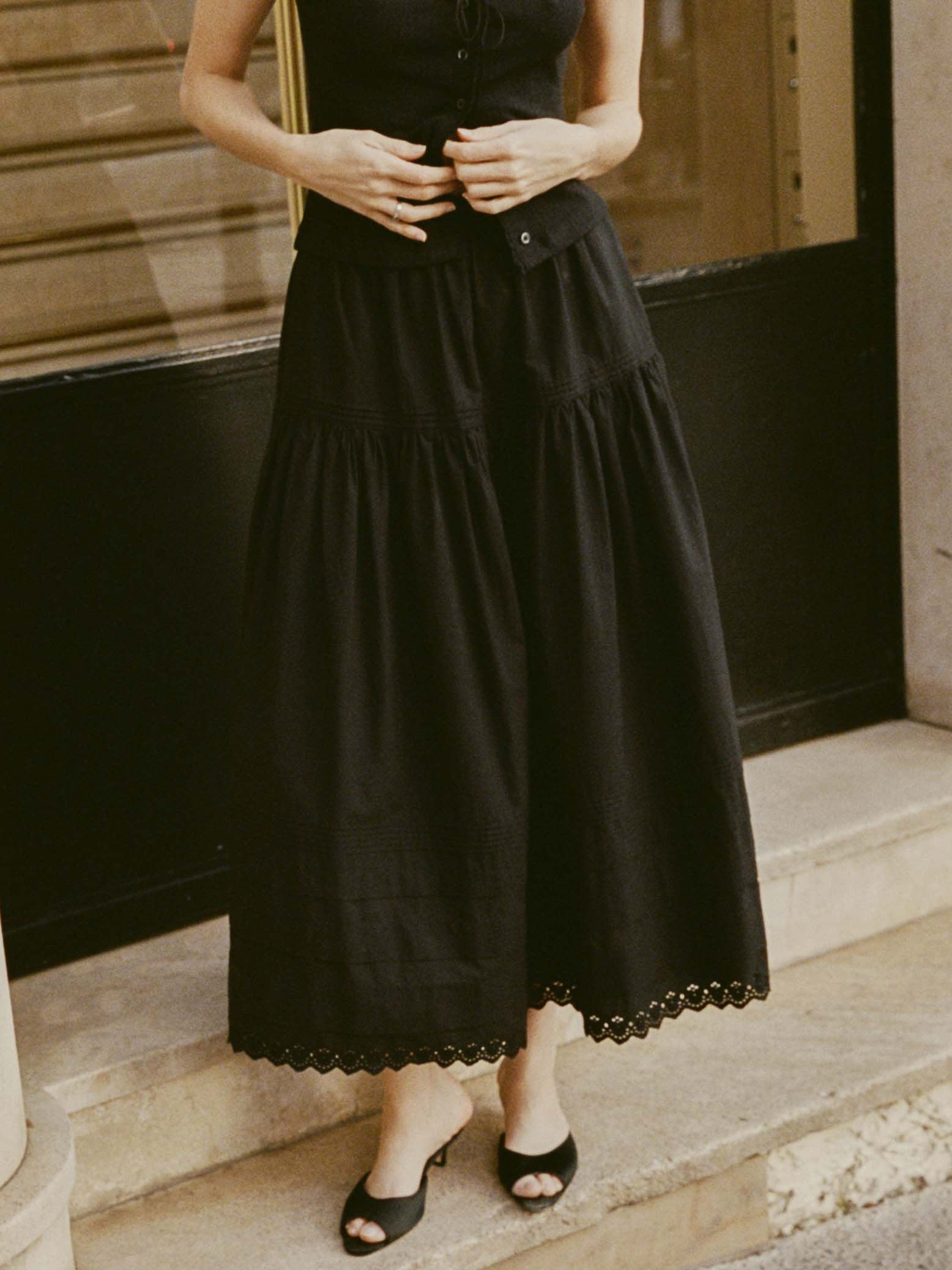 Sebastiane midi-skirt is crafted of lightweight cotton. This style features tiered seaming with eyelet trim and an A-line silhouette.