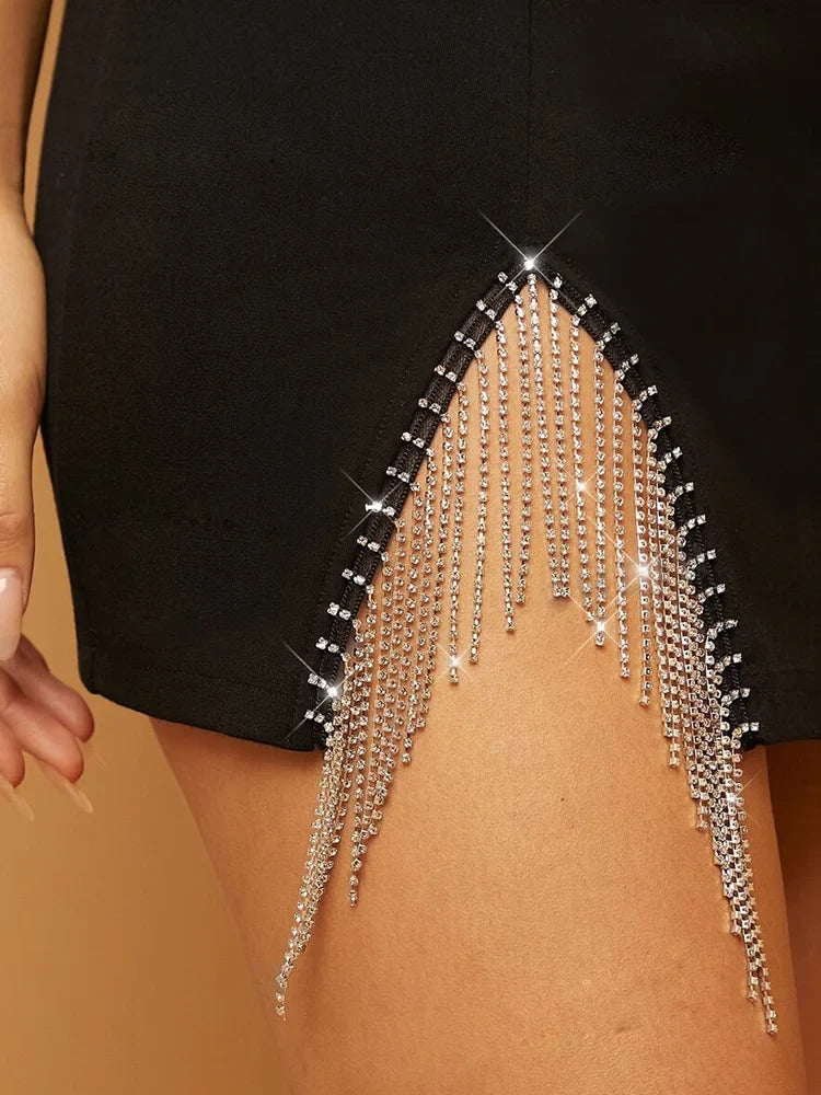 Black Y2K Chain Slim Fit High Waist Solid Color Patchwork Skirt