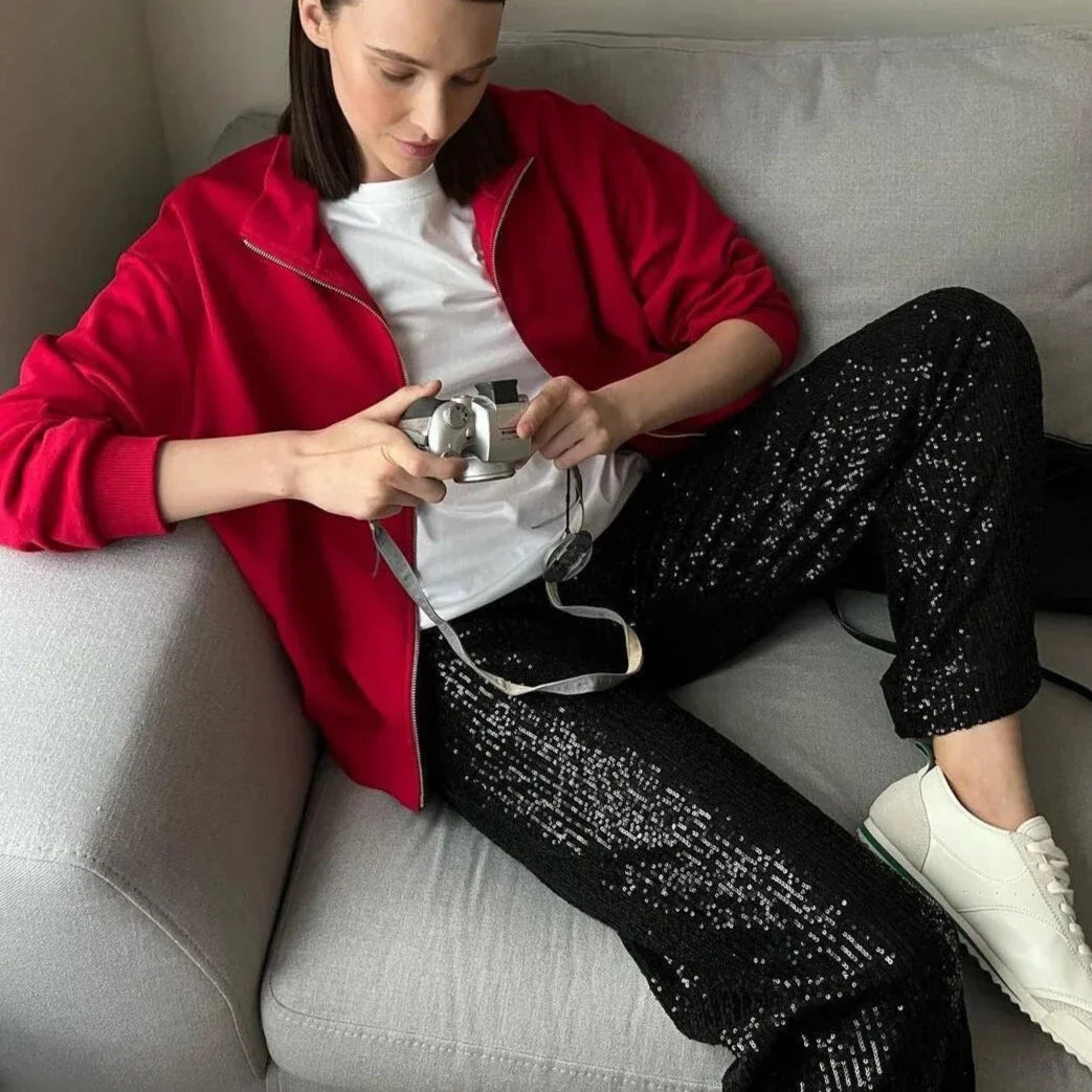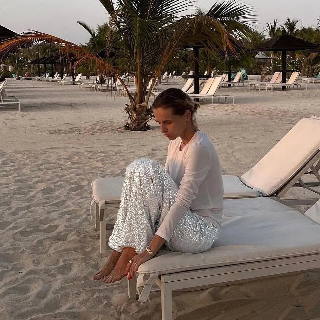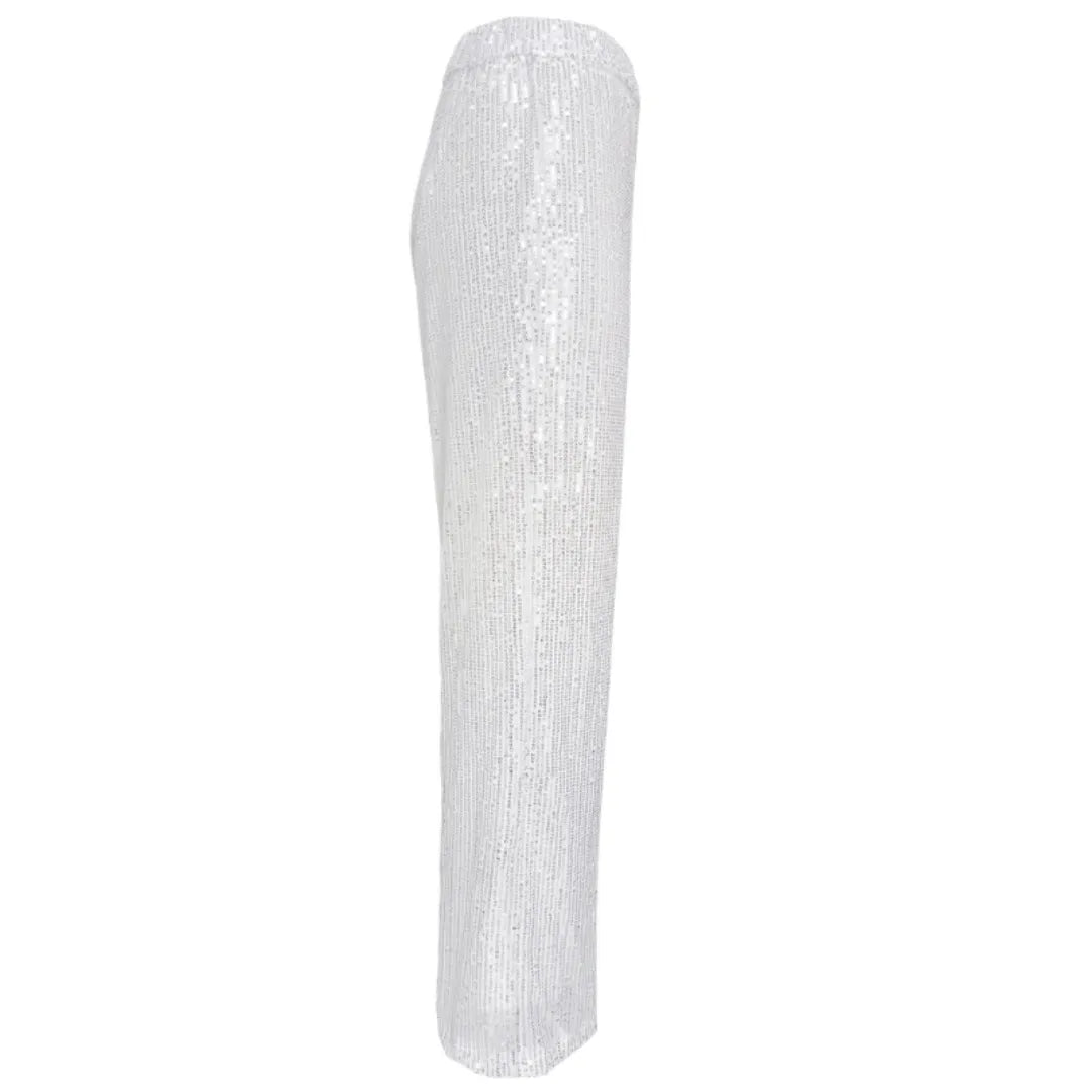 Shine bright in the Shona Metallic Sequin Wide Leg Pants! Choose between shimmering gold and silver and show off your unique style. Perfect for any party or casual fashionista style. these wide-leg pants are a statement-making piece. Get ready to glitter the night away! 🤩