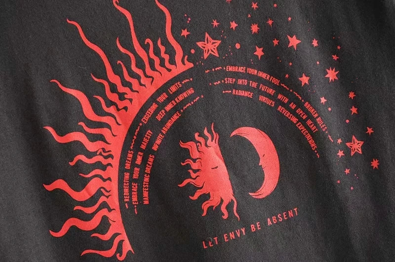Add some sunshine to your wardrobe with the Soleil Luna Graphic Print Cropped T-Shirt. This playful and quirky top features a unique graphic print and cropped hemline for a fun and stylish look. Perfect for any casual occasion literally for day and night. this t-shirt is sure to make you stand out with its cool graphic print design.