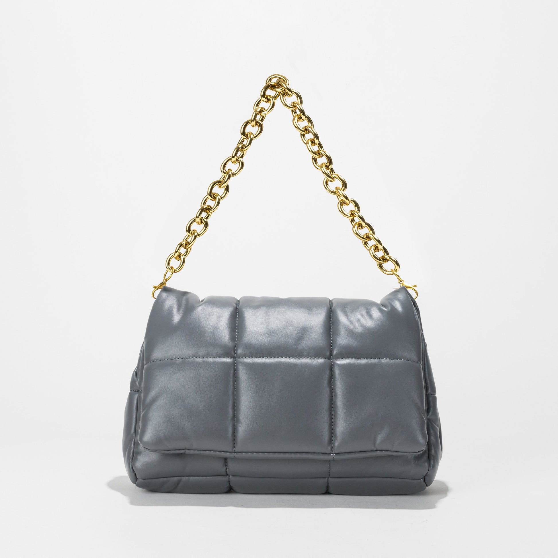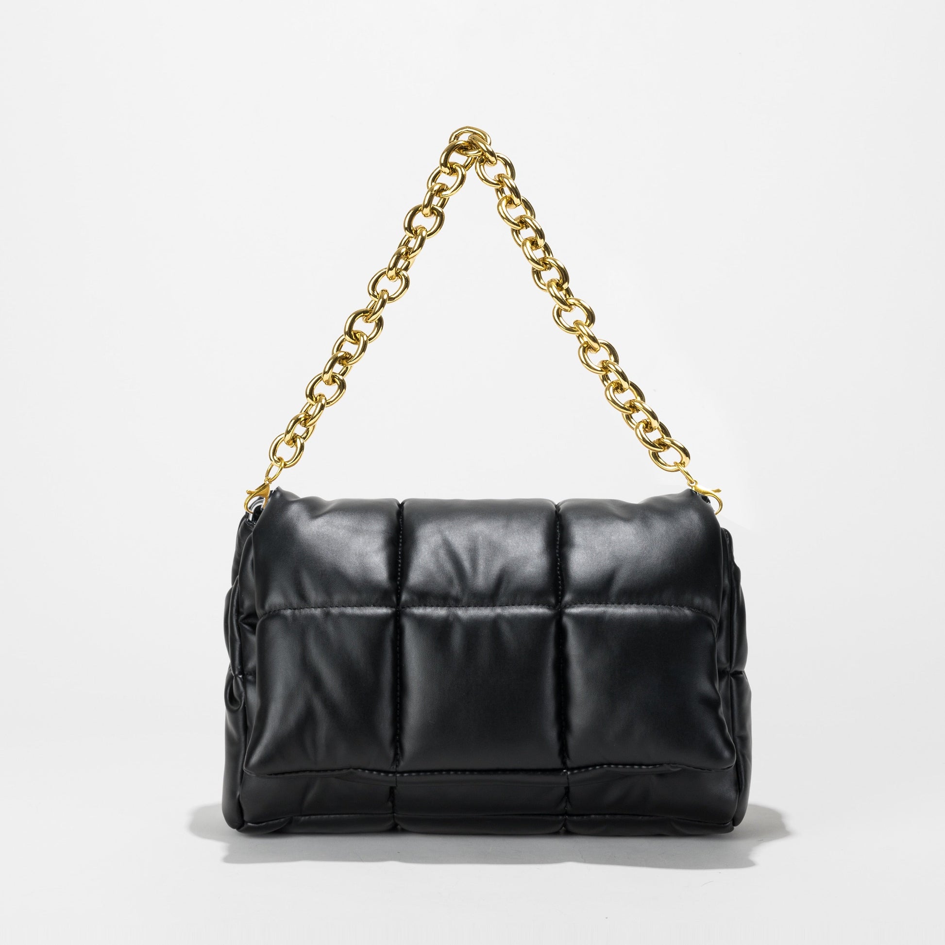 Terra Puffer Pillow Shoulder Bags. Luxe and stylish quilted puffer shoulder bags. Envelop folding flap bag style with expandable side snap closures. Trendy and popular sporty puffer look. Come in two versions: faux PU leather with leather strap and PU leather with Gold Chain Strap.