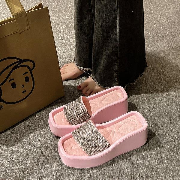 Take your style to the next level with these glitzy Thierry Rhinestone Sequin platform slippers! High platform wedge. EVA sole with PU lining. these slippers will take you on to a new height in sparkling style. They come in two standout colors. and make a splashing statement whenever you wear them. Rock out in rhinestones. and let your feet shine bright!