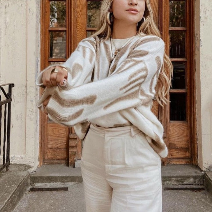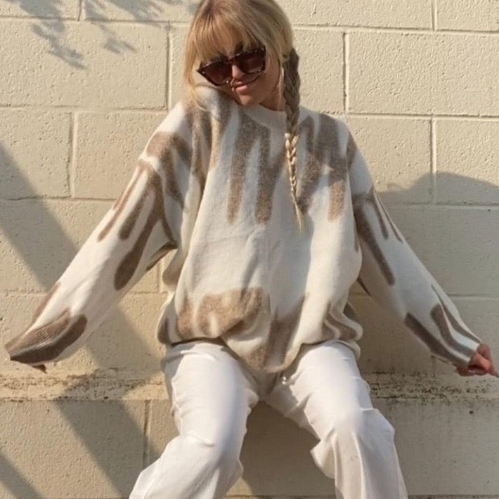 Tiffany Printed Wool Sweater - 4 Colors. Boxy one sized comfy pullover sweater with line drawing prints. Brush stroke? Dripping liquid? This abstract print sweater are simple stylish and fun.