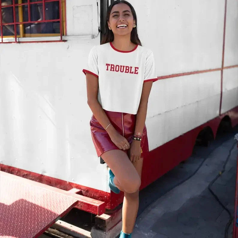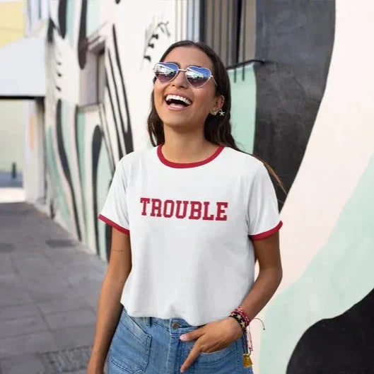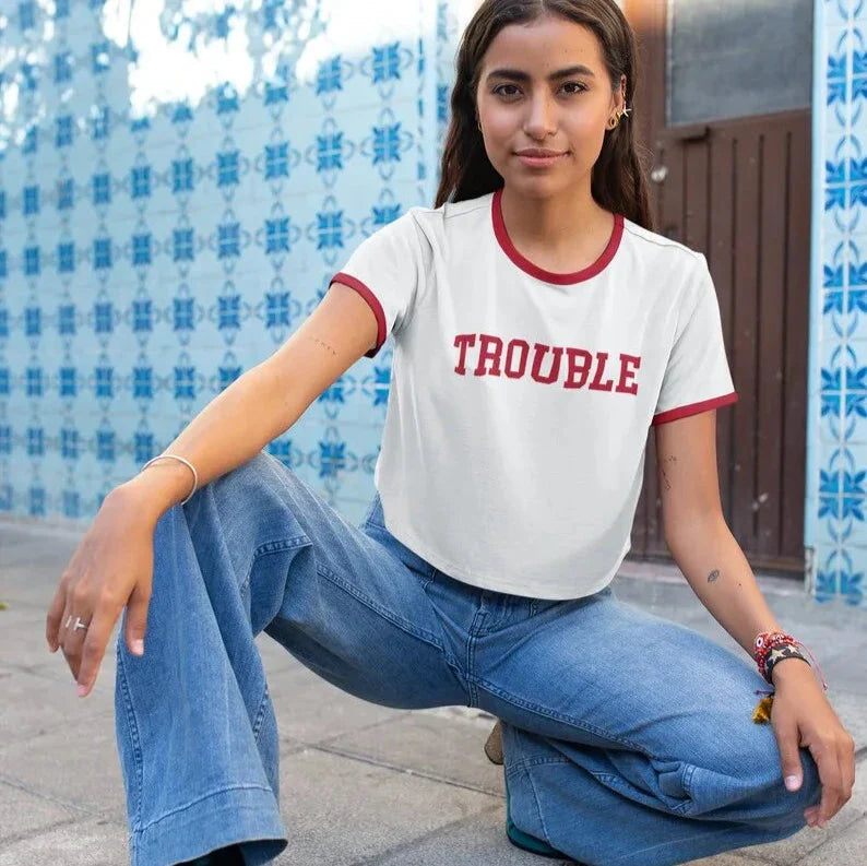 Get into some stylish trouble with our Trouble Cropped T-Shirt! This fun and quirky statement shirt will add some edge to any outfit. Don't be afraid to cause some trouble (in the best way) with this unique cropped tee.