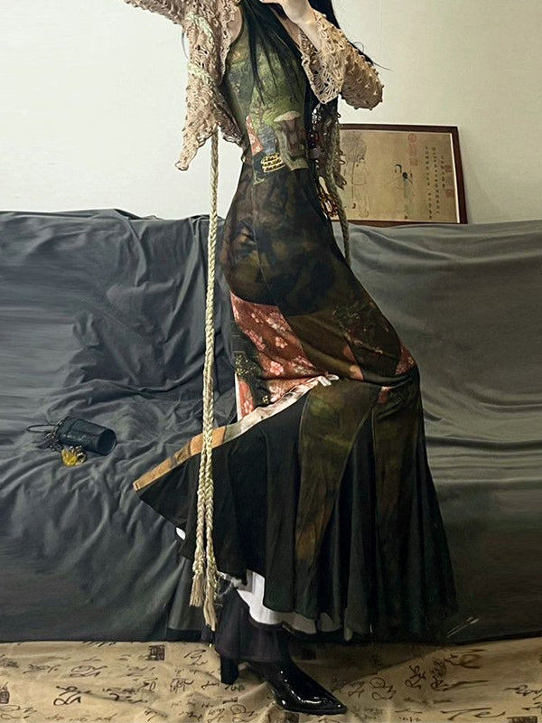 Vintage Irregular Splice Pleated Hem Maxi Dress with Print