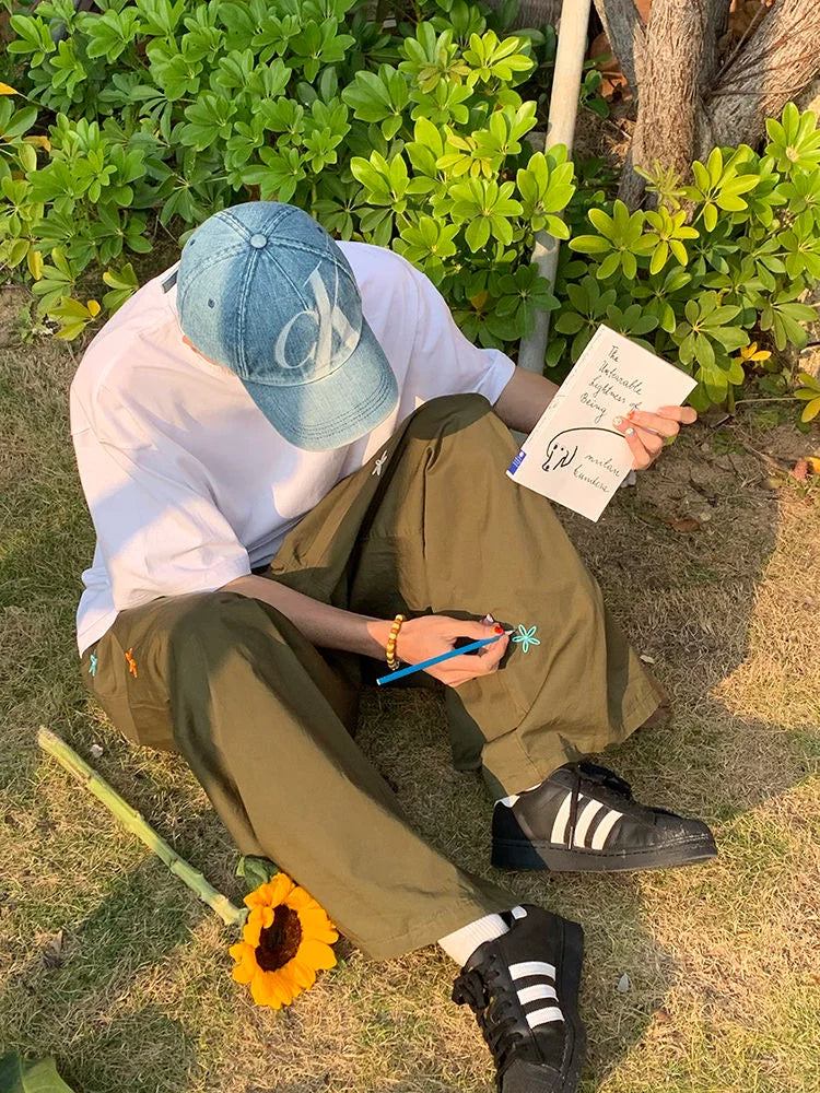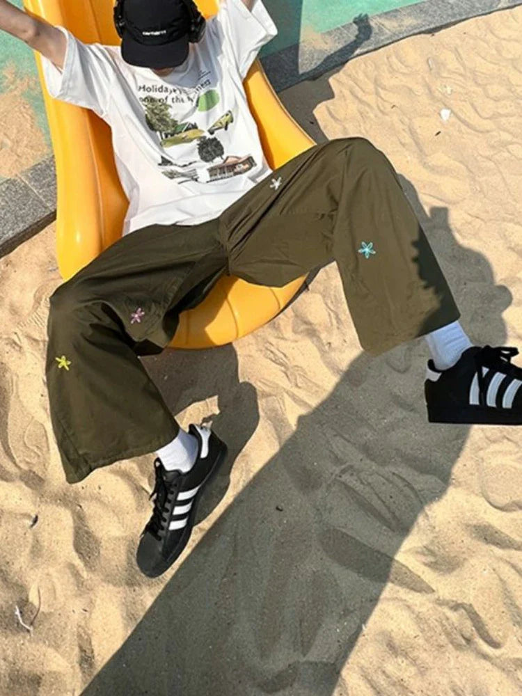 Vintage Korean Green Cargo Harajuku Hippie Kpop Floral Embroidery Baggy Pant
