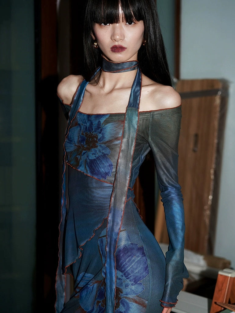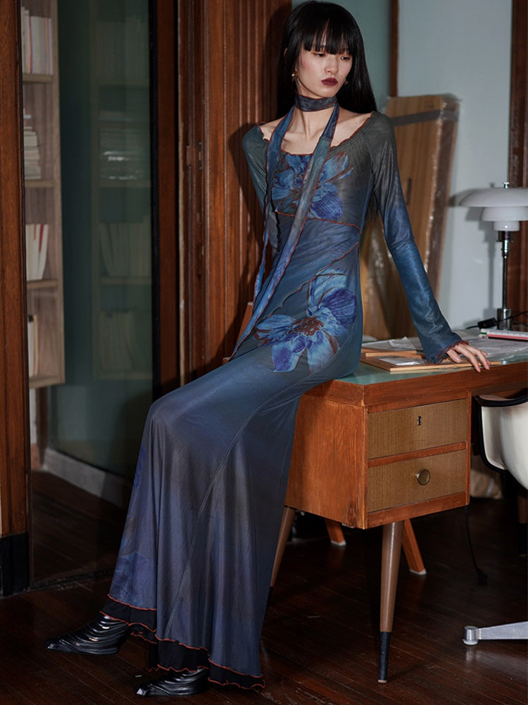 Vintage Off Shoulder Flower Printed Mesh Slim Maxi Dress
