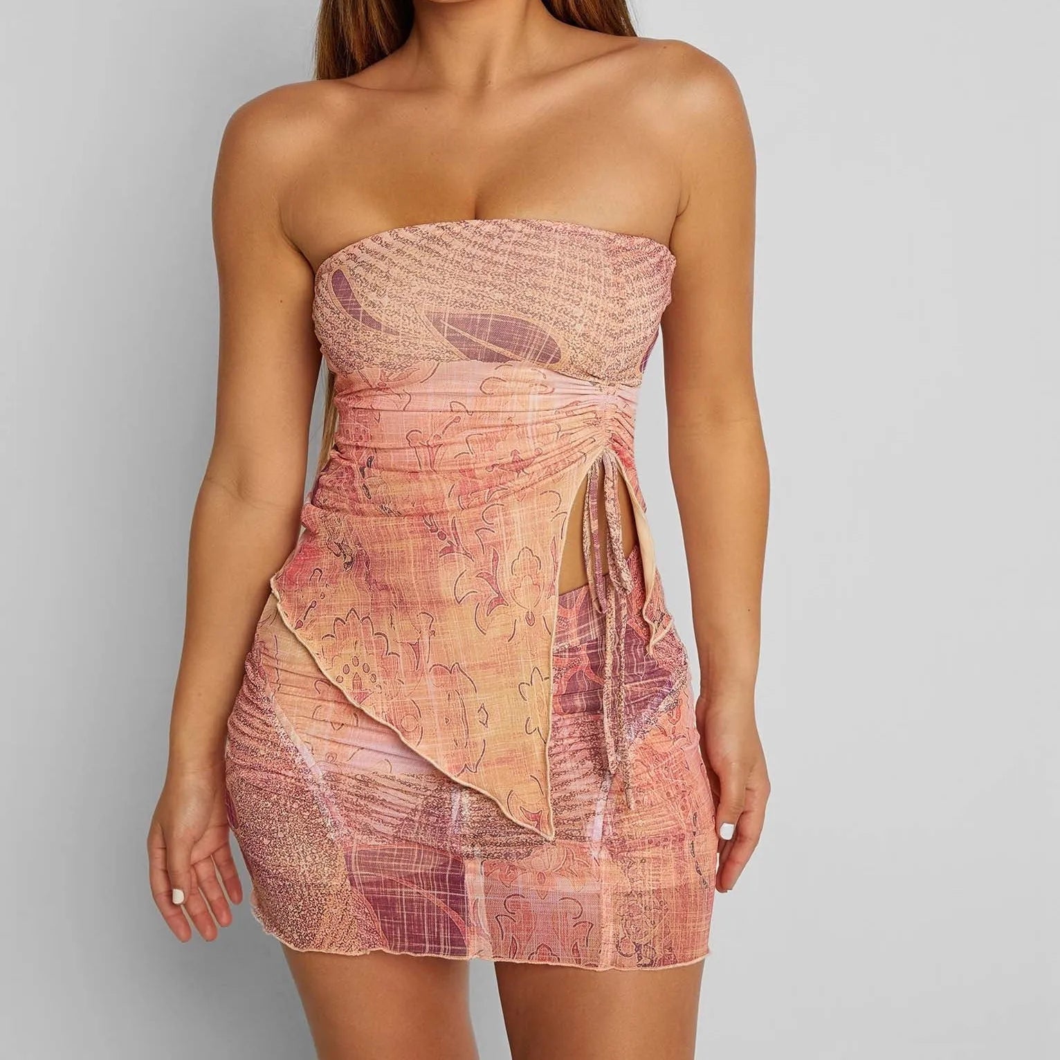 Vintage Printed Strapless Tube Top Bodycon Mini Skirt