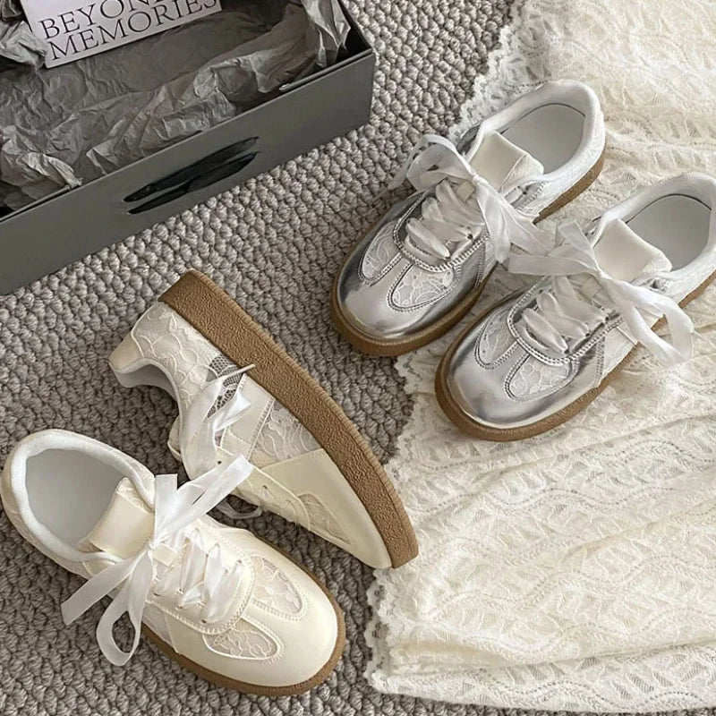 Soft Leather + Lace Mesh Walking Shoes Breathable Casual Sneaker New Lace Up Non-slip Flat Sports Jogging Running Trainers